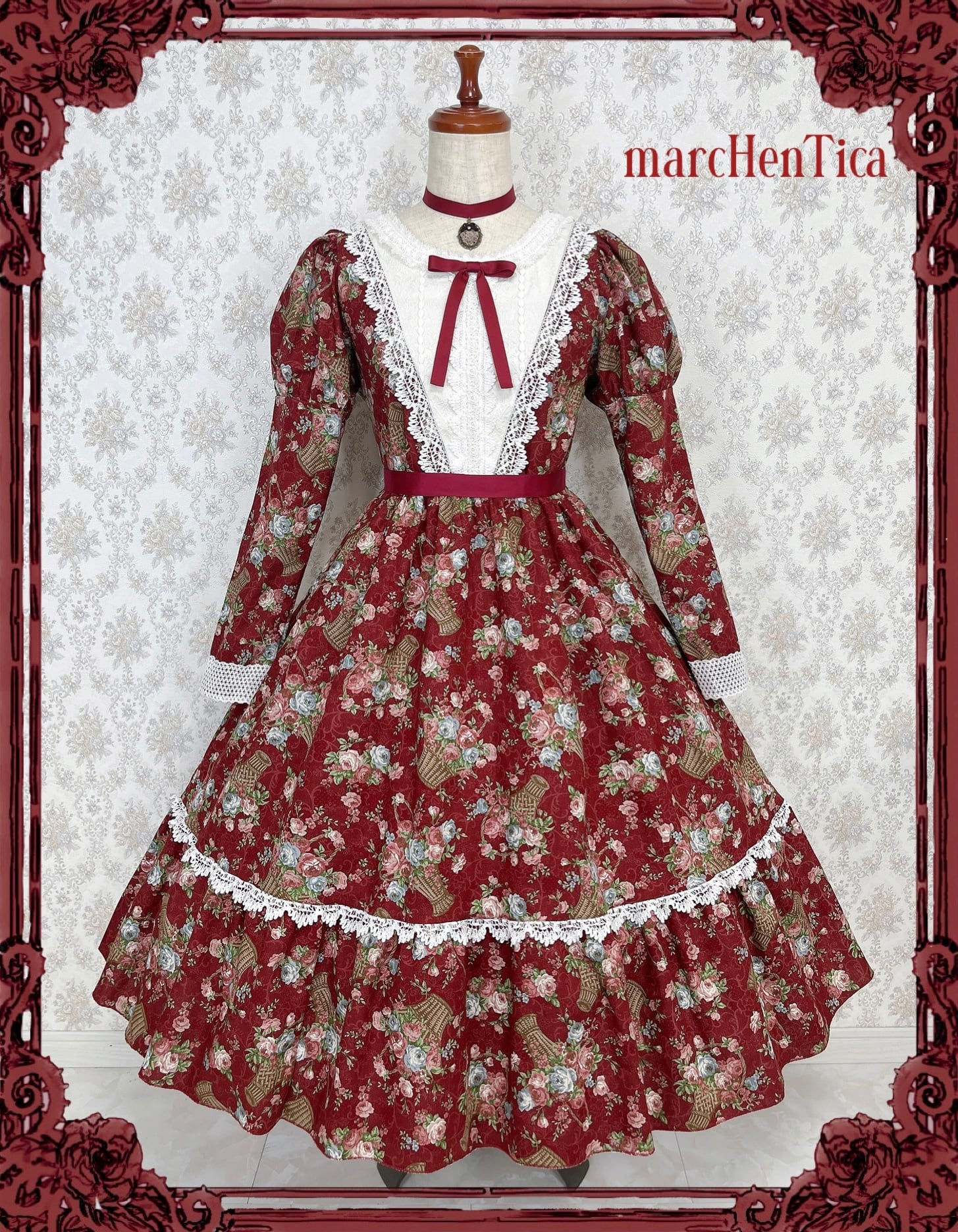 ※ワンピースの発送予定日を記載したご予約券をお送りいたします。 【ローズバスケットワンピース】 ヨーク切替が上品な薔薇の花籠柄ワンピースです。ワイン、モーヴピンク、ネイビーの3色展開です。 袖も可愛くて上品なマトンスリーブ形状になっております。 ウエストのリボンで上半身のサイズを調整できます。 リラックスしたい時は緩めに結ぶなどしてシーンに合わせた着用が可能です。 ※チョーカー、胸元リボン、ウエストリボン、つけ襟は別売です。 ワイン ・チョーカー(ローズブーケチョーカー:ワイン 28cm) ・ウエストリボン(ワイン) ・シングルリボン(ワイン) モーヴピンク ・チョーカー(ローズブーケチョーカー:ブラウン28㎝) ・ウエストリボン(ブラウン) ・シングルリボン(ブラウン) ※4枚目はローズバスケット付襟、クラリスリボンコサージュをつけた例です。 ネイビー ・チョーカー(ローズブーケチョーカー:ブラック28㎝) ・ウエストリボン(ブラック) ・シングルリボン(ブラック) サイズ: プリンセスサイズ(通常のフリーサイズ) バスト約96cm、ウエスト約96cm 着丈 上半身着丈約38cm+スカート丈約 72cm (レース込み) ※その他のサイズは画像をご参照ください。 素材: 綿80% 麻20%(レース除く) 説明文をよくお読みのうえご購入をお願い致します。