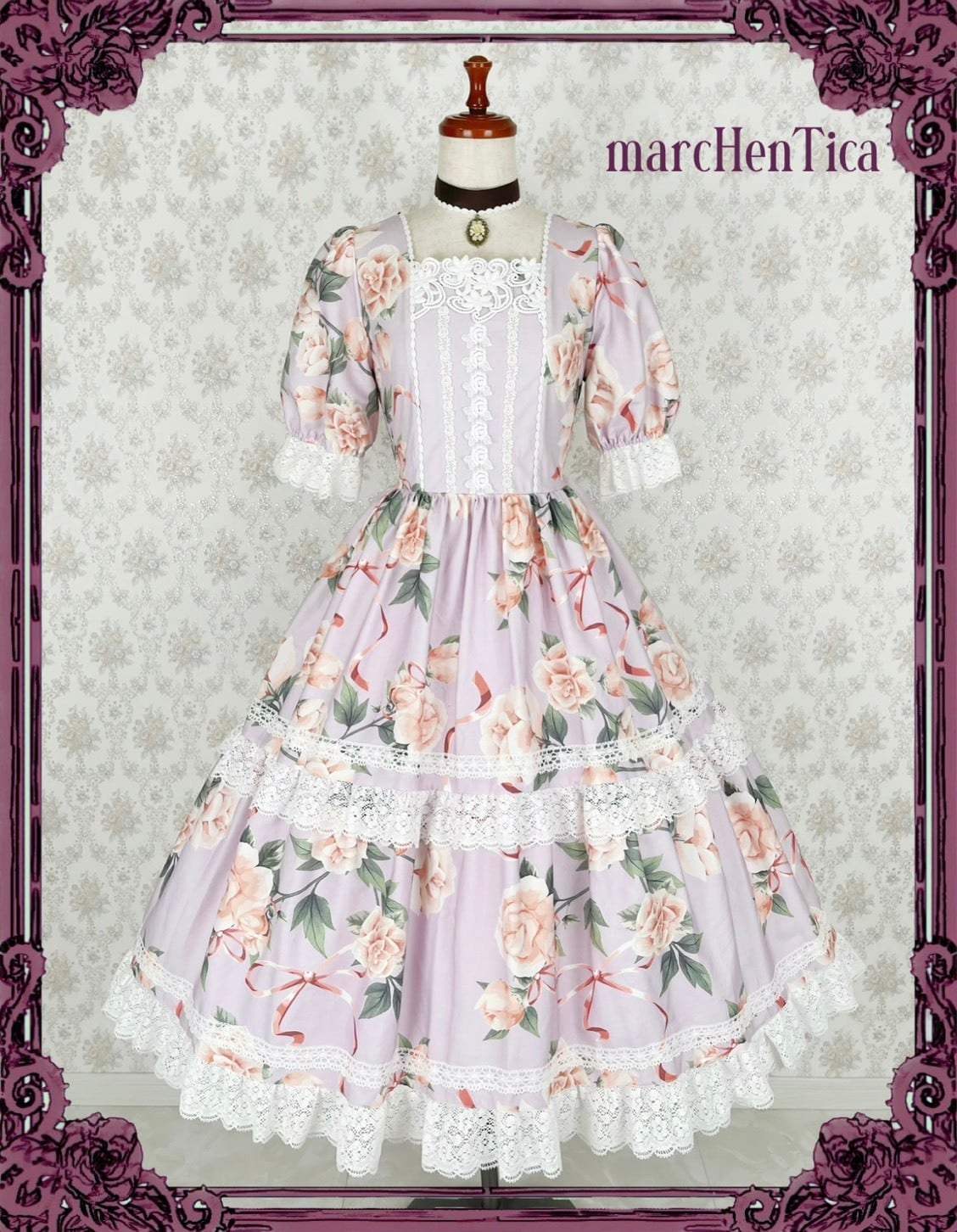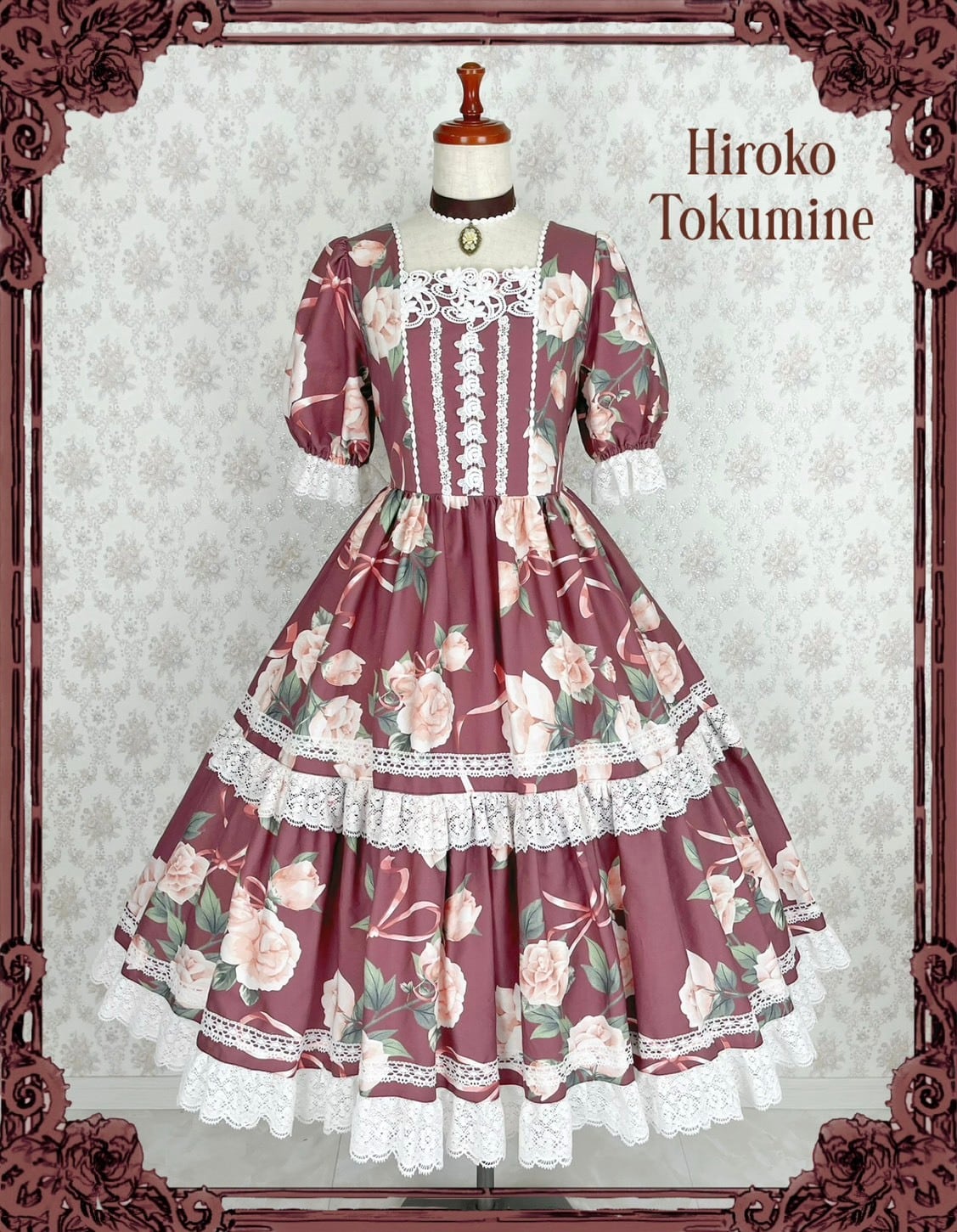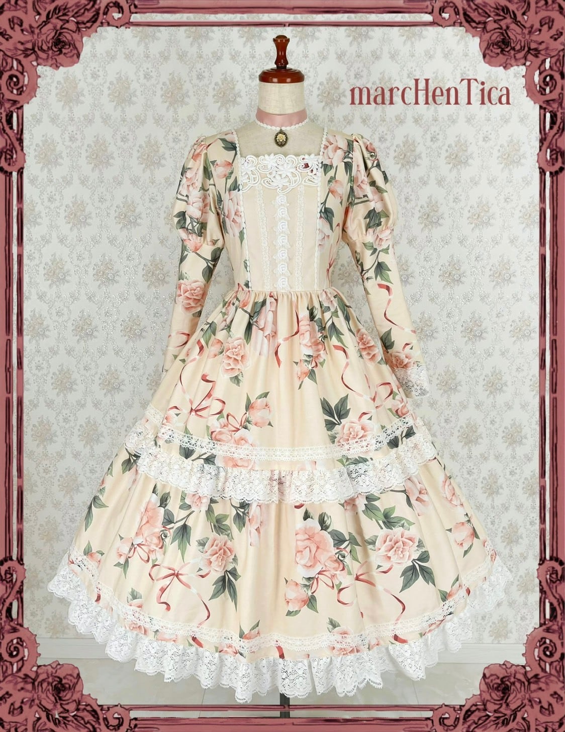プリモローズワンピースはプリモドールワンピースの形に、大きな薔薇柄が美しい生地を採用したワンピースです。スカートは2段ティアードとなっております。