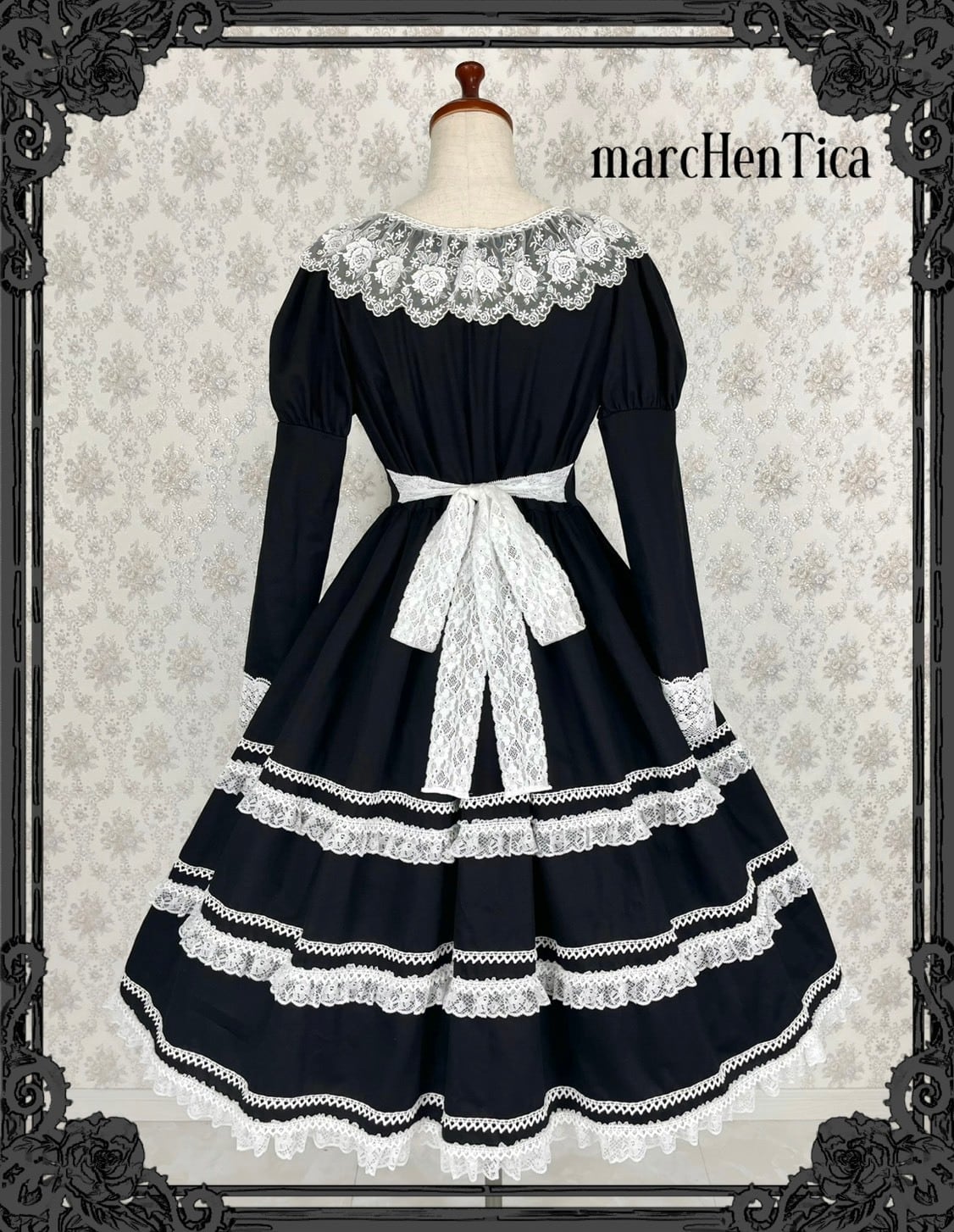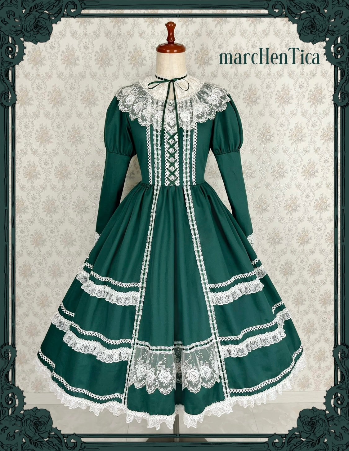 エスメドールワンピースはレースをふんだんに使用したクラシカルな雰囲気のワンピースです。ブラック、ワイン、グリーンと落ち着いた色味の3色展開となります。