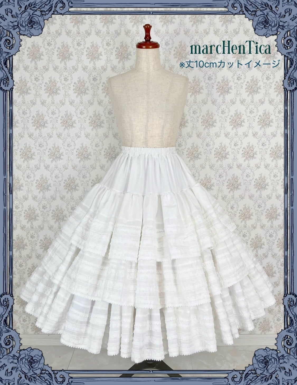 フリルとピンタックがあしらわれた無地のスカートです。ホワイトとクリームの2種類がございます。画像はクリームが通常丈、ホワイトが10cmカットを選択した場合のイメージになります。※丈延長の場合は上部ウエスト部分の1段目を延長します。