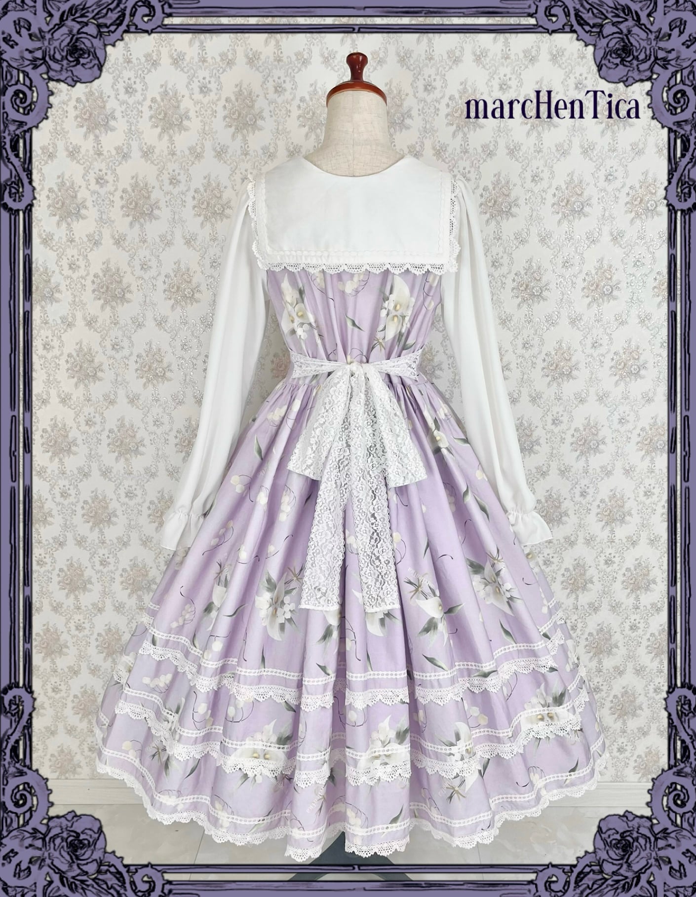 リリアナブーケワンピースはセーラーカラーが可憐なワンピースです。カラーバレーとすずらんがプリントされた生地となっており、淡く優しい雰囲気のお洋服となっております。