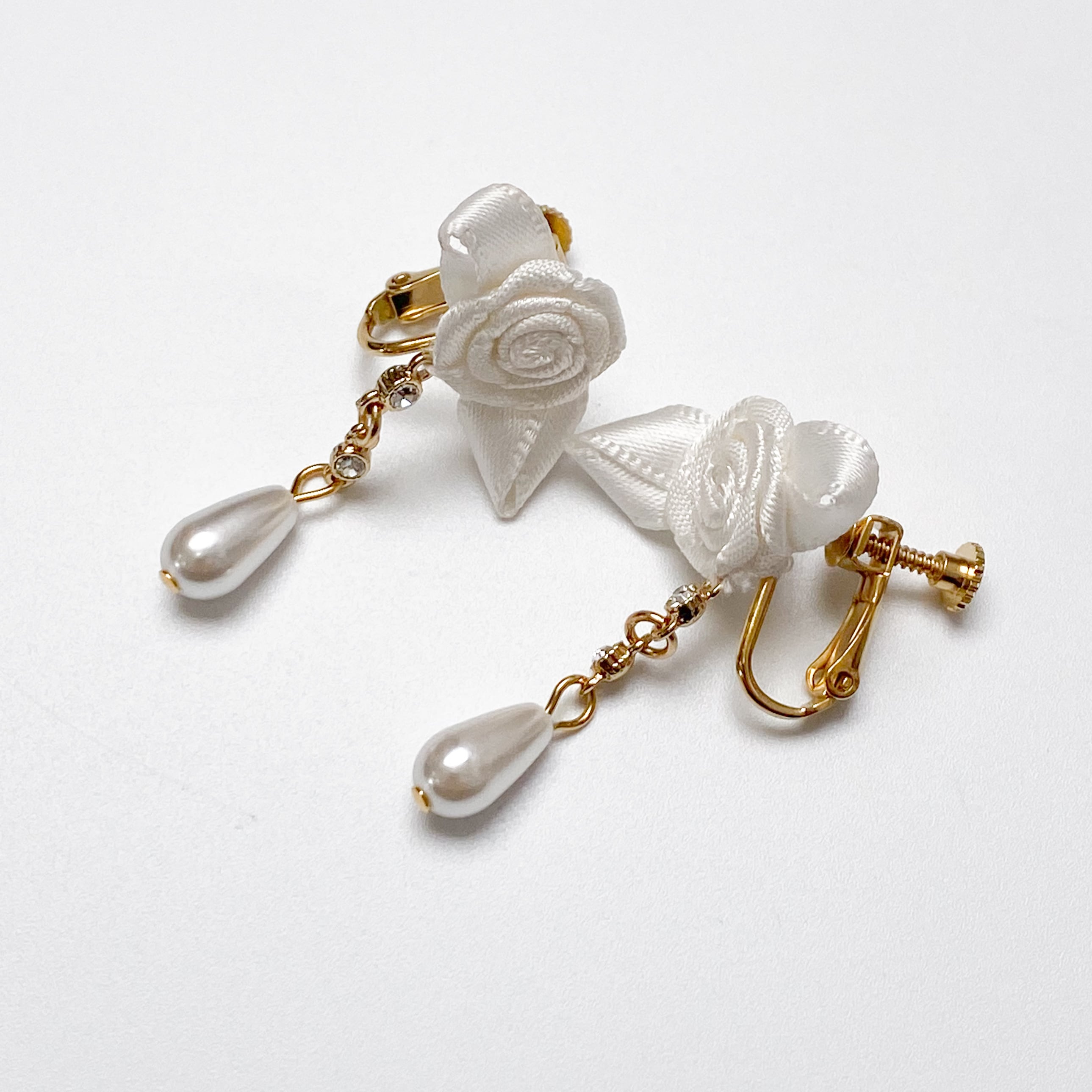 ホワイトローズイヤリング/ピアスは、薔薇のチャームをあしらった可愛らしいイヤリングです。 説明文をよくお読みのうえご購入をお願い致します。 ※オプションにてピアスにも変更可能です。 ※商品はアトリエでのオールハンドメイドで制作しております。 ※納期は受注生産の為、約1ヵ月~2ヵ月ほどになります。