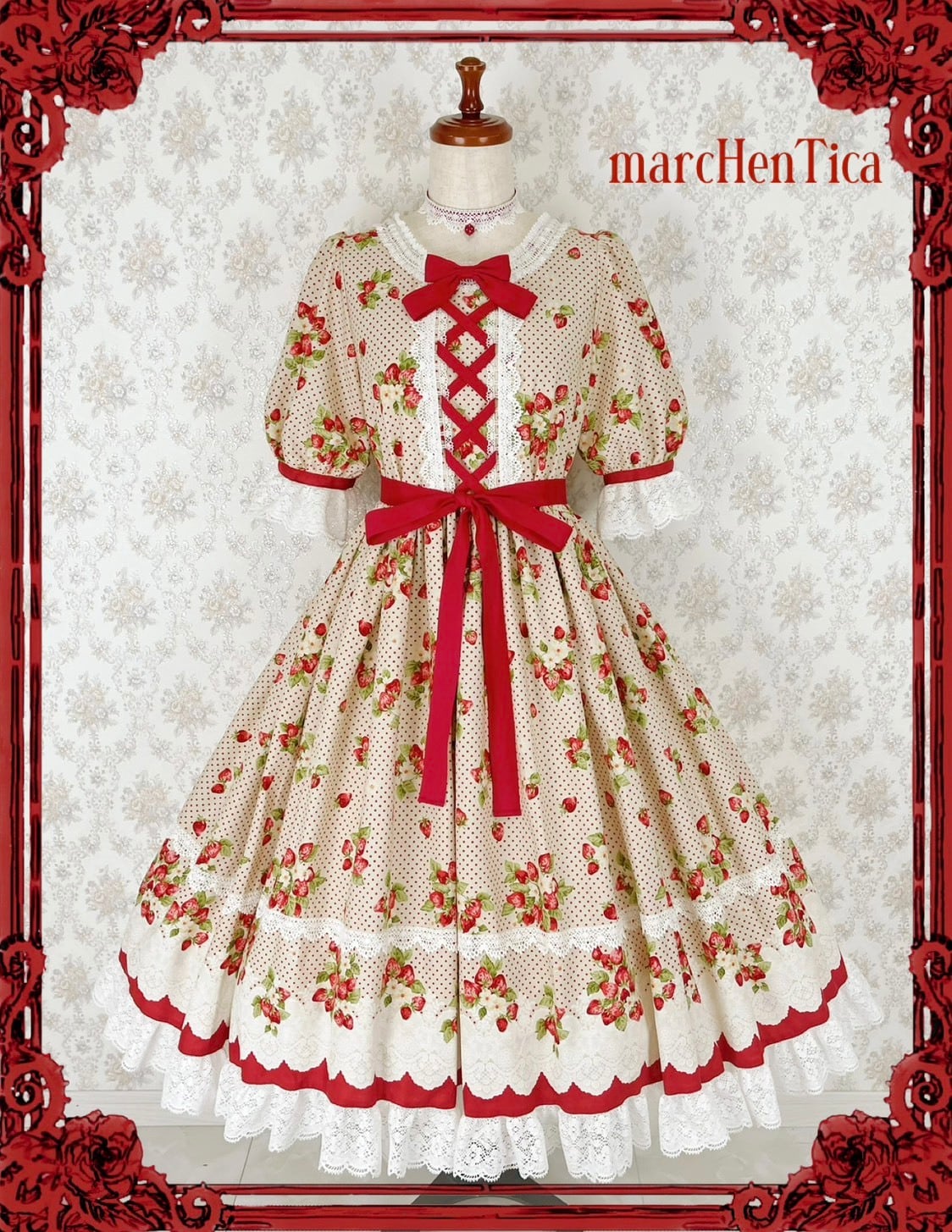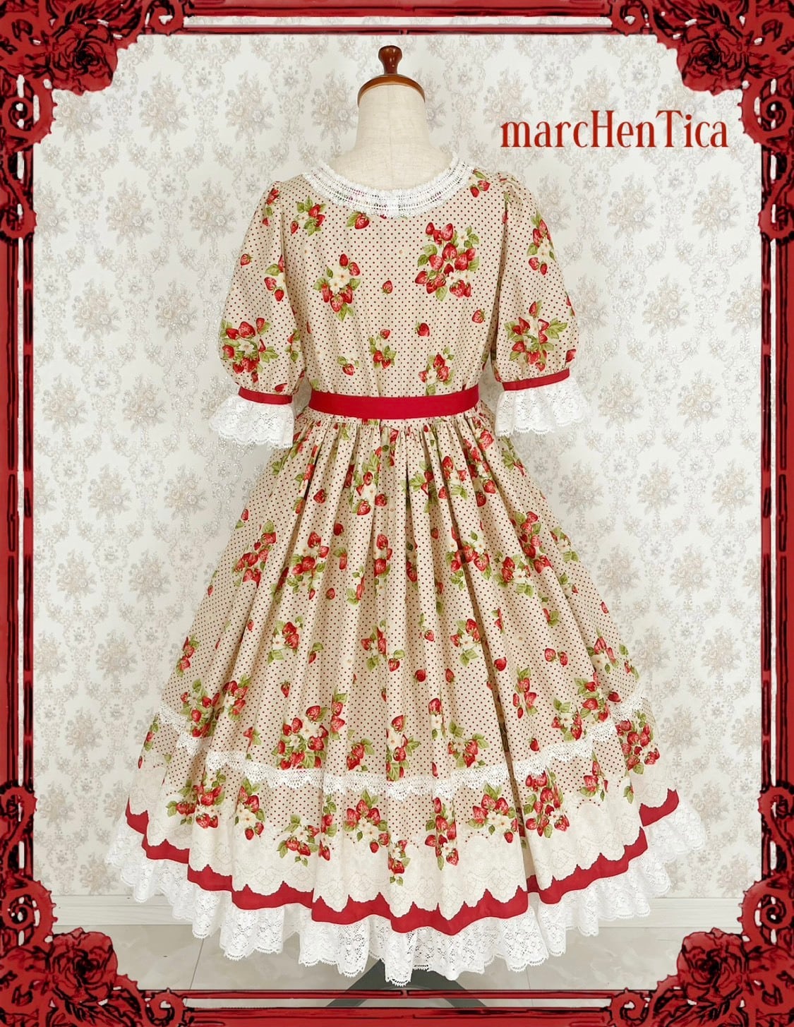 ストロベリーパフェワンピースは苺柄に白いレースがまるでパフェの様な可愛いワンピースです。レッド、ピンクの2色展開です。
