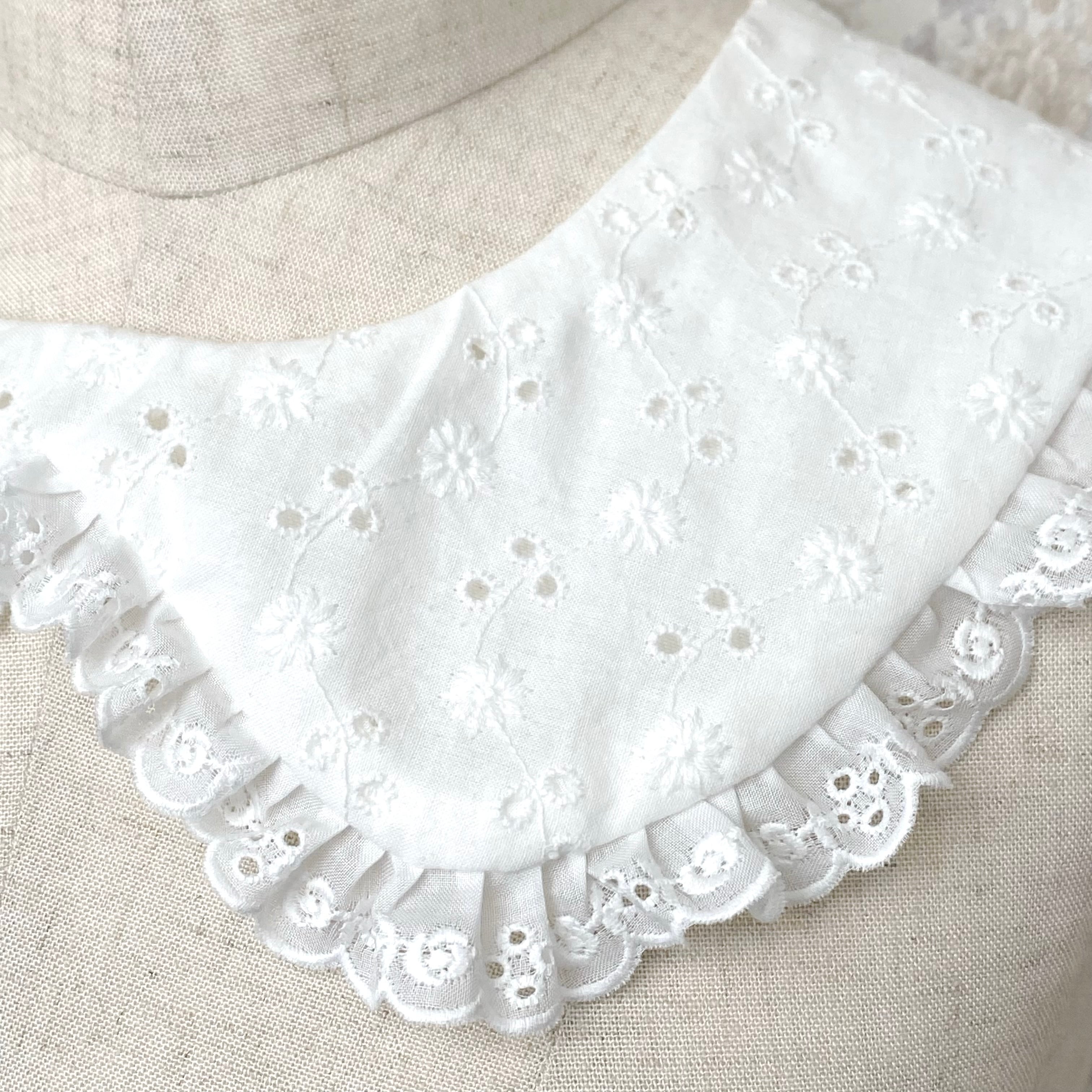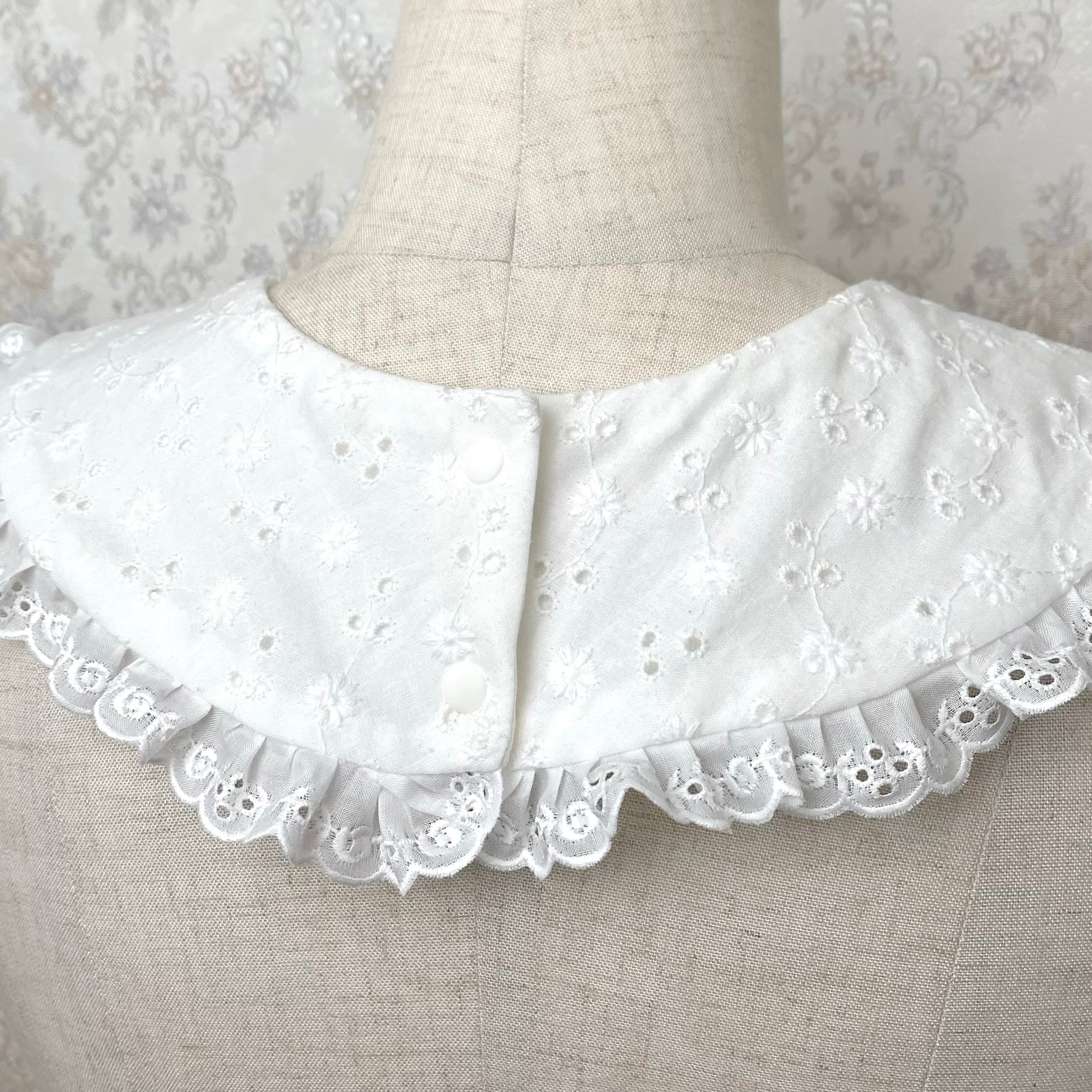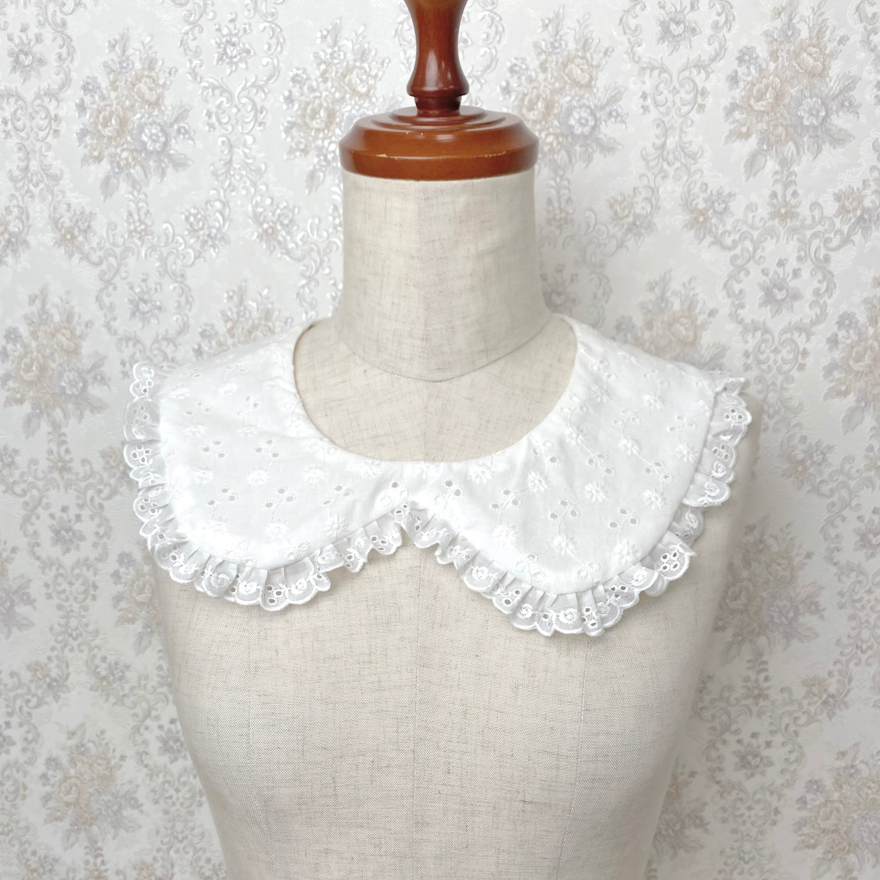 コットンレースフリルつけ襟は薔薇のレースをあしらったラウンドカラーの可愛いつけ襟です。スナップボタンで取り外し可能なデザインになっています。 ※説明文をよくお読みのうえご購入をお願いいたします。 ※商品はアトリエでのオールハンドメイドで制作しております。 ※受注生産の為、納期は約1~2か月となります。