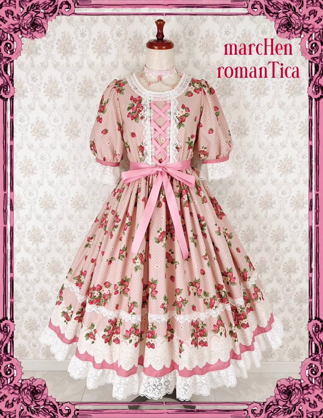 ストロベリーパフェワンピースは苺柄に白いレースがまるでパフェの様な可愛いワンピースです。レッド、ピンクの2色展開です。