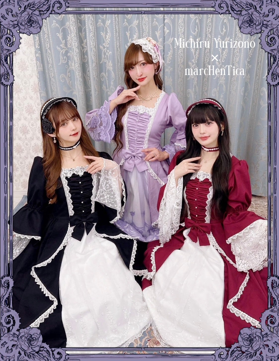 百合園みちる様とのコラボワンピースになります。胸元のたっぷりギャザーとスカートの美しいヒダ、そして繊細なチュールレースがとても華やかな一着です。ドレスのようなワンピースとなっております。お色は3色展開です。
