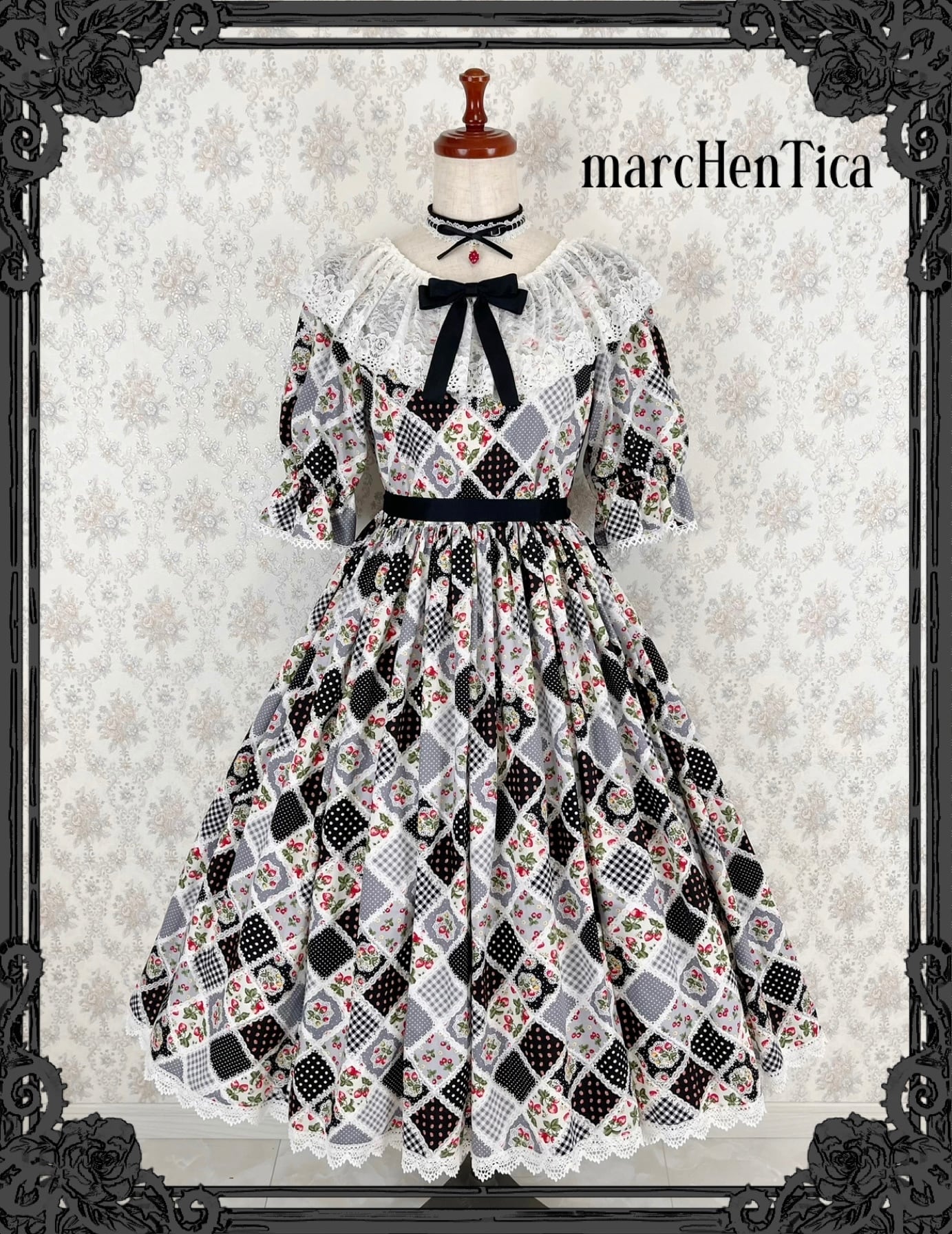 ブラック: ミルフィーユドールチョーカー(ブラック)+ストロベリーチャーム