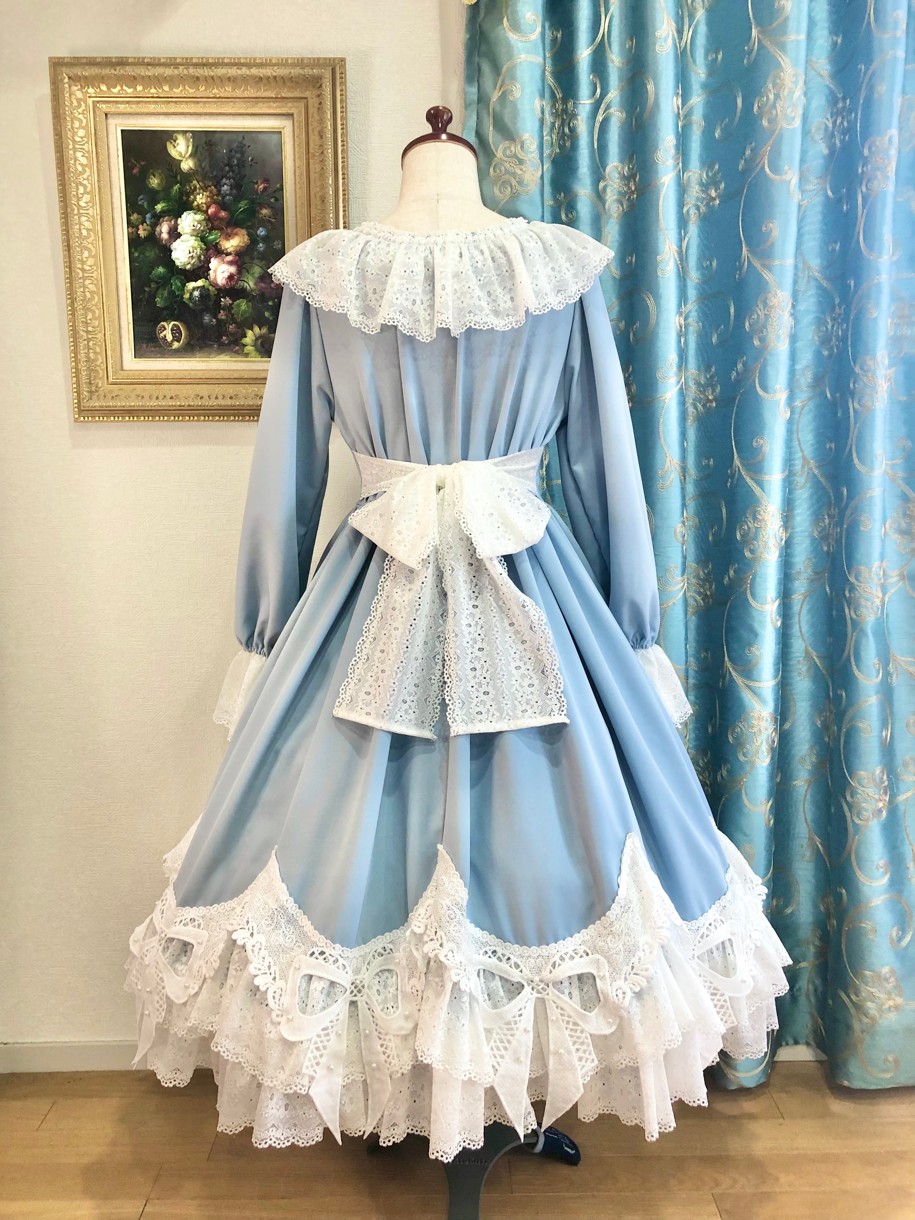アメリアワンピースは裾のスカラップとリボンデザインのレースが可愛い華やかなワンピースです。ウエスト部分は小さくV字のラインになっており、また、首周り、お袖、裾、バックリボンにレースをたっぷり使用しております。