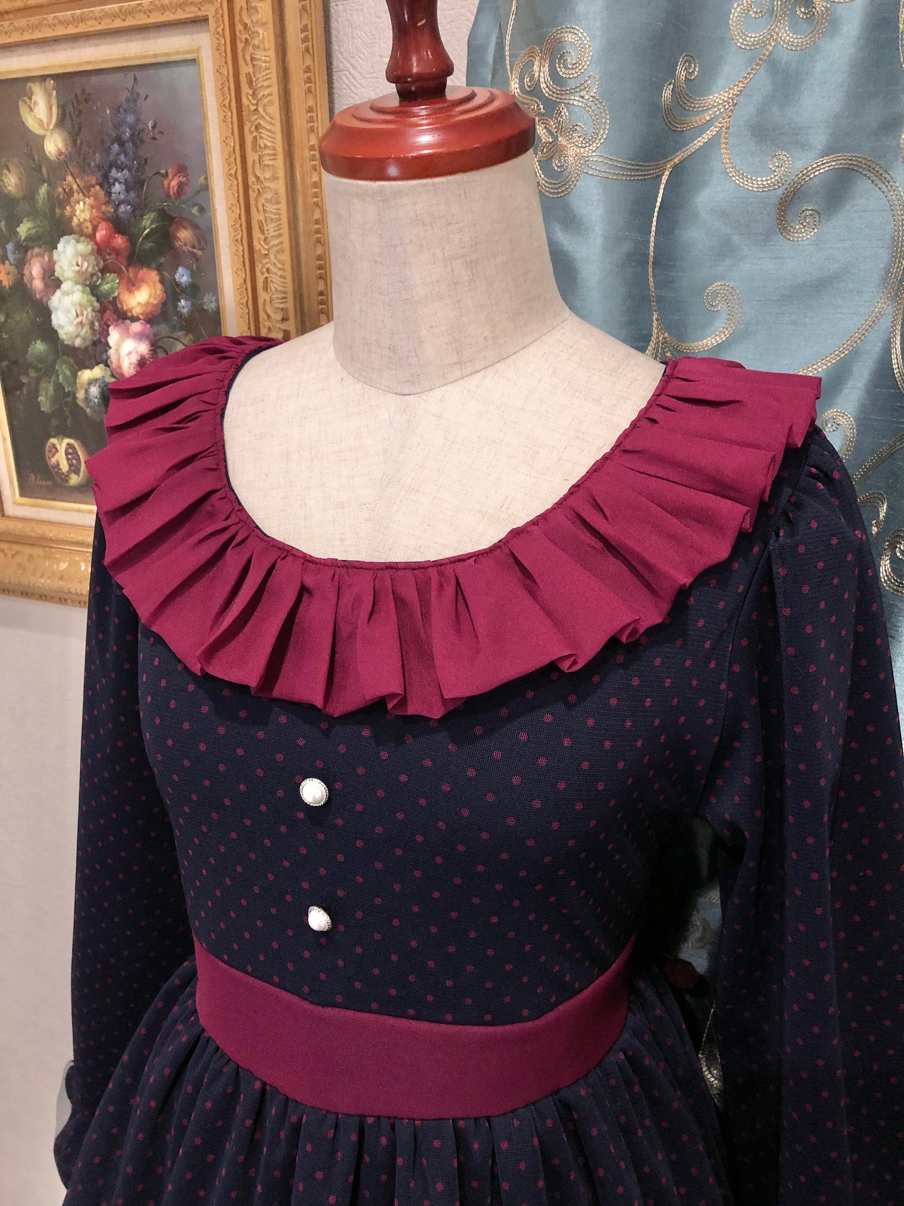 ダーシーワンピースはネイビーに赤紫のドットチュール生地を被せた、どこかダークでレトロな雰囲気のあるワンピースです。