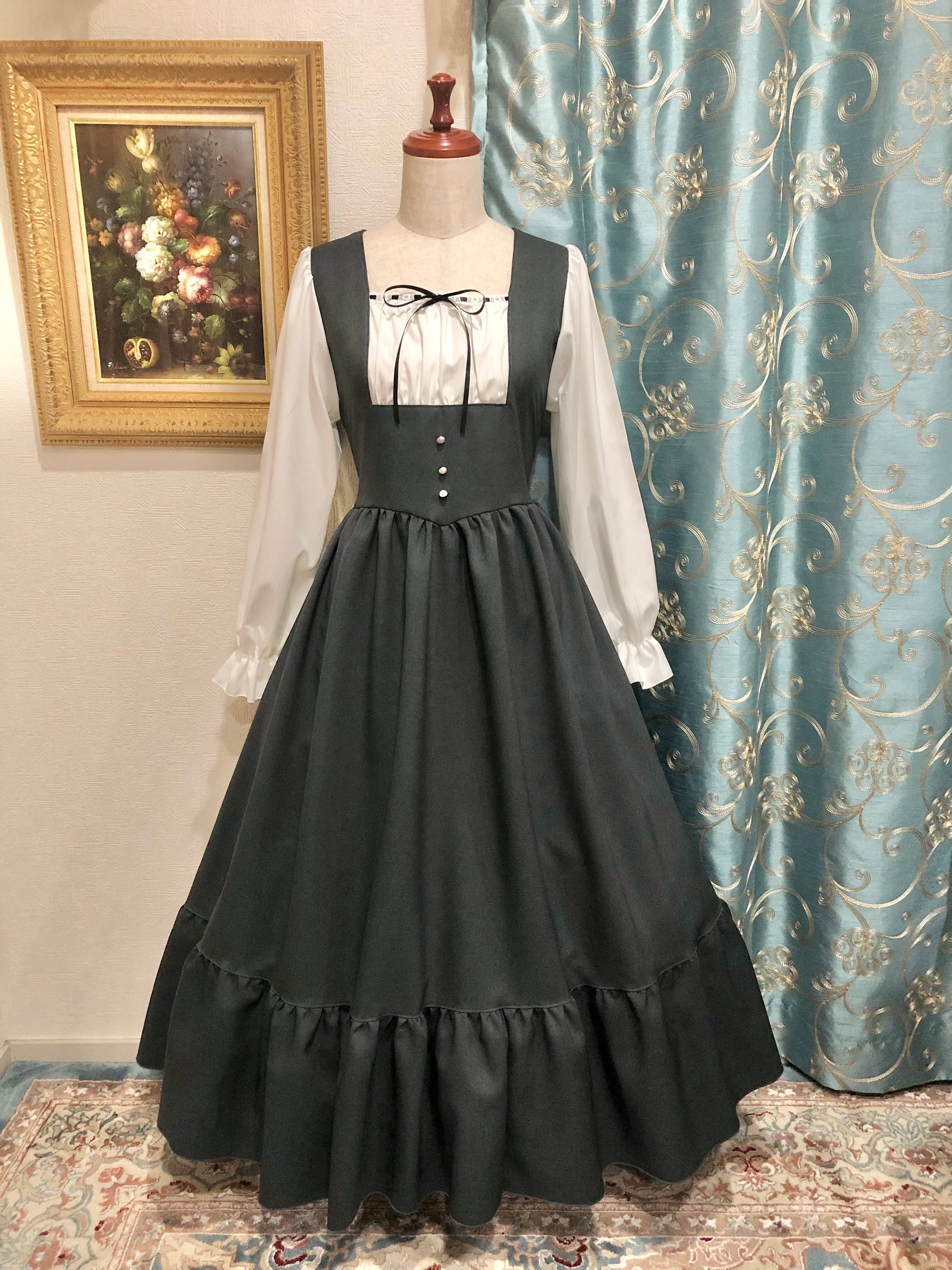 エマ(真剣な) エマワンピースは胸元の切替がドイツの民族衣装「ディアンドル」のようなデザインになっている、上品で可愛いワンピースです。 サイズ:F 身幅96cm、ウエスト96cm 着丈115cm 最下段裾フリル約25cm 素材: 綿50%、ポリエステル50% 説明文をよくお読みのうえご購入をお願い致します。 ※商品はアトリエでのオールハンドメイドで制作しております。 ※各色10着未満の少量生産です。無くなり次第終了となります。