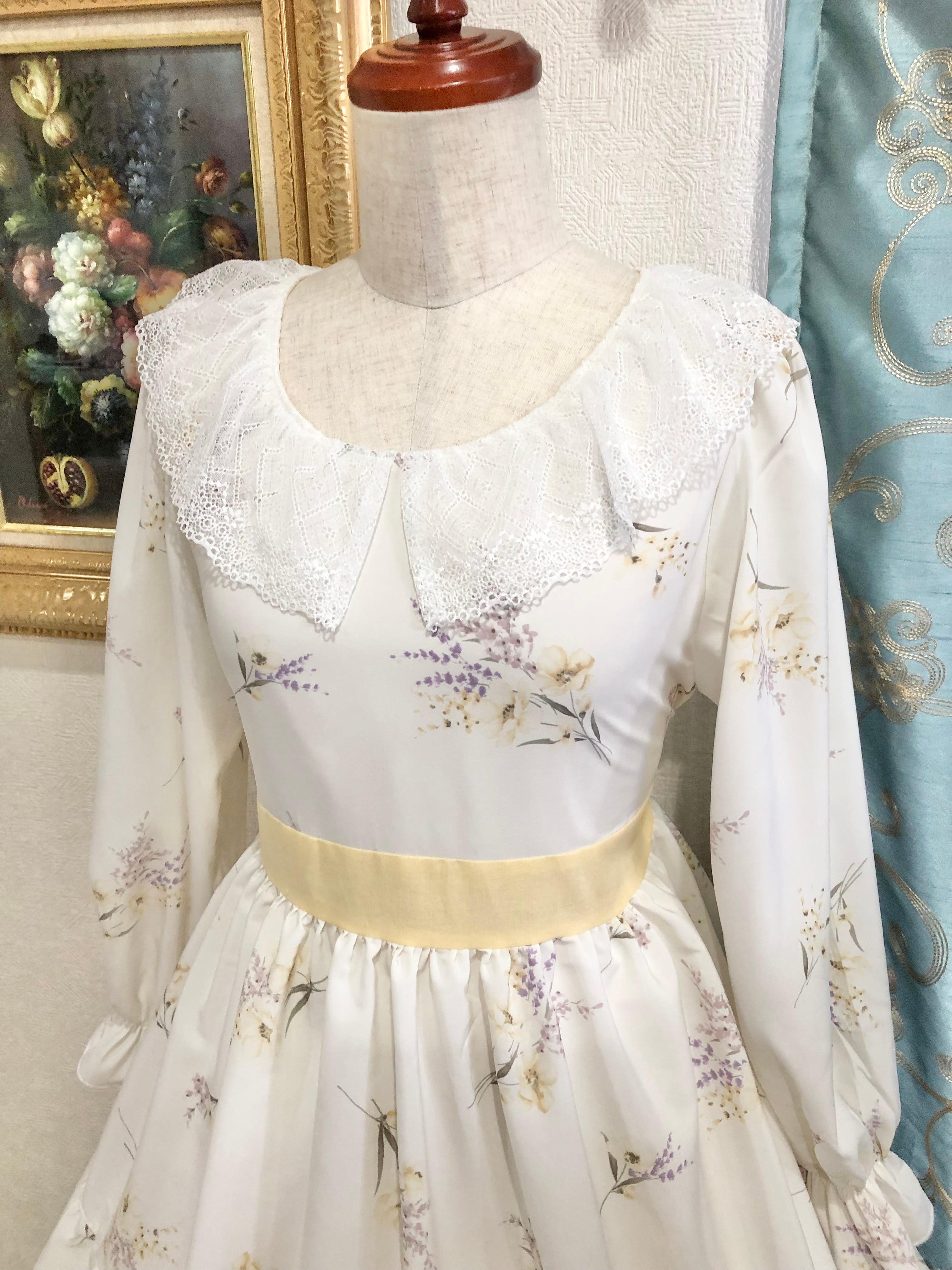 ウエストの黄色の切替がシルエットをスッキリみせてくれるデザインで、繊細な幅広レースが上品です。