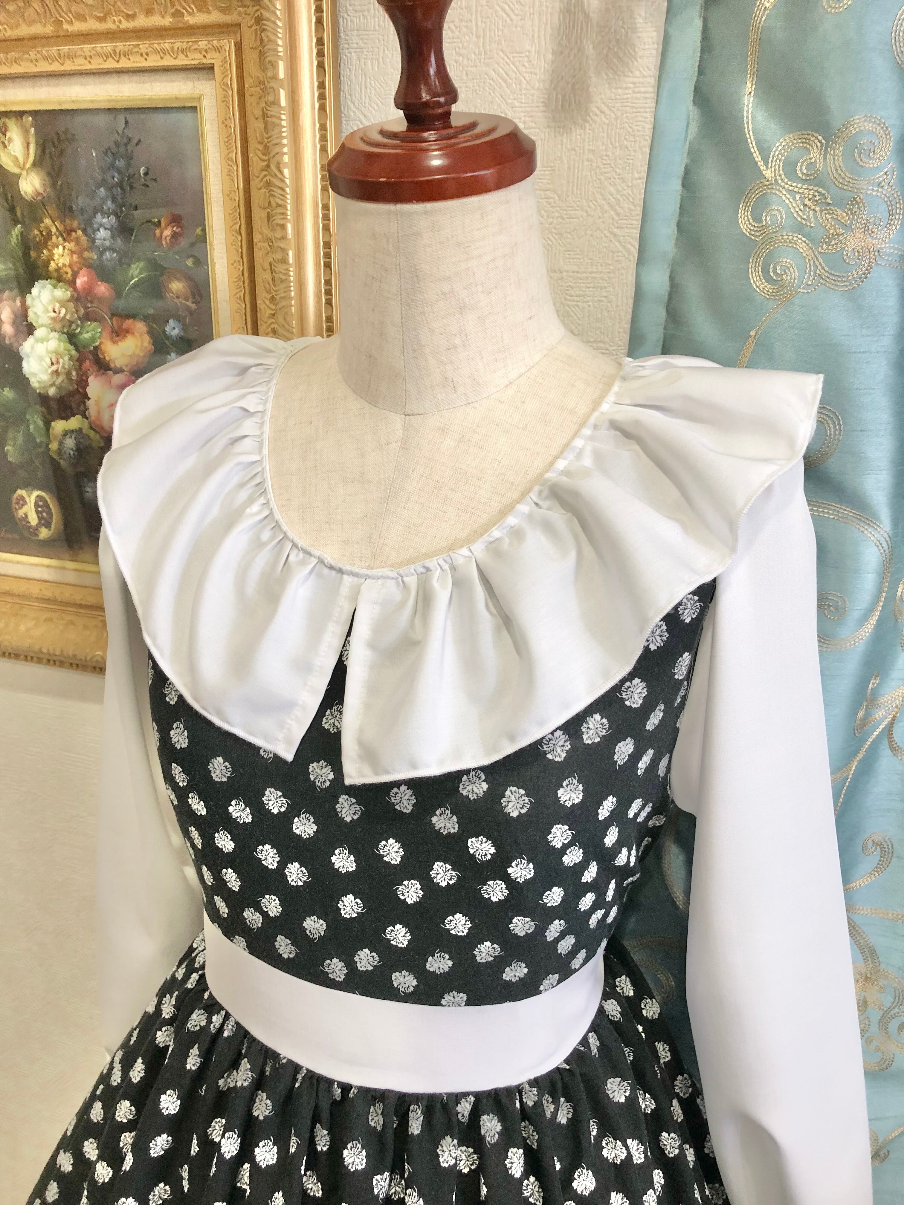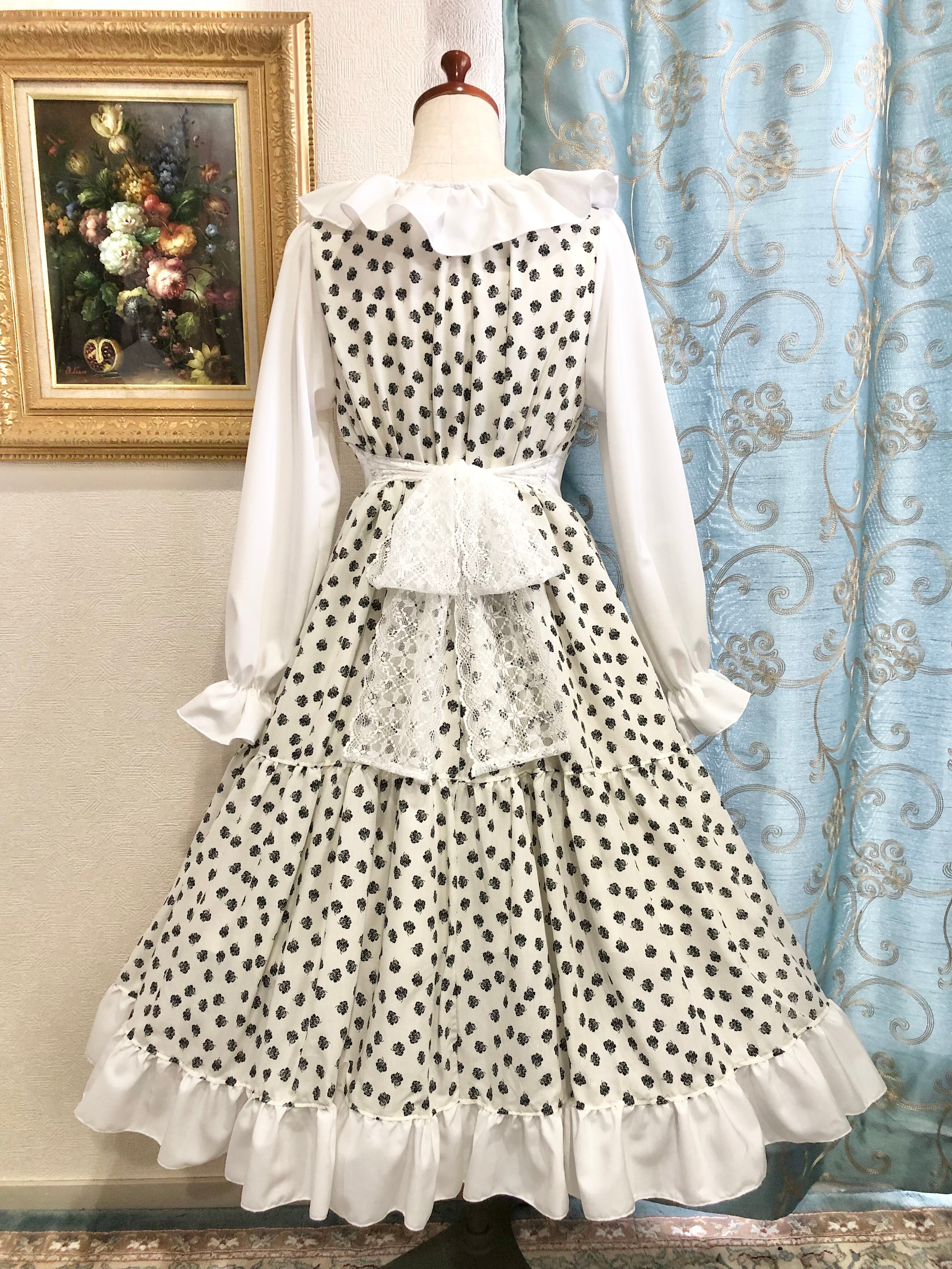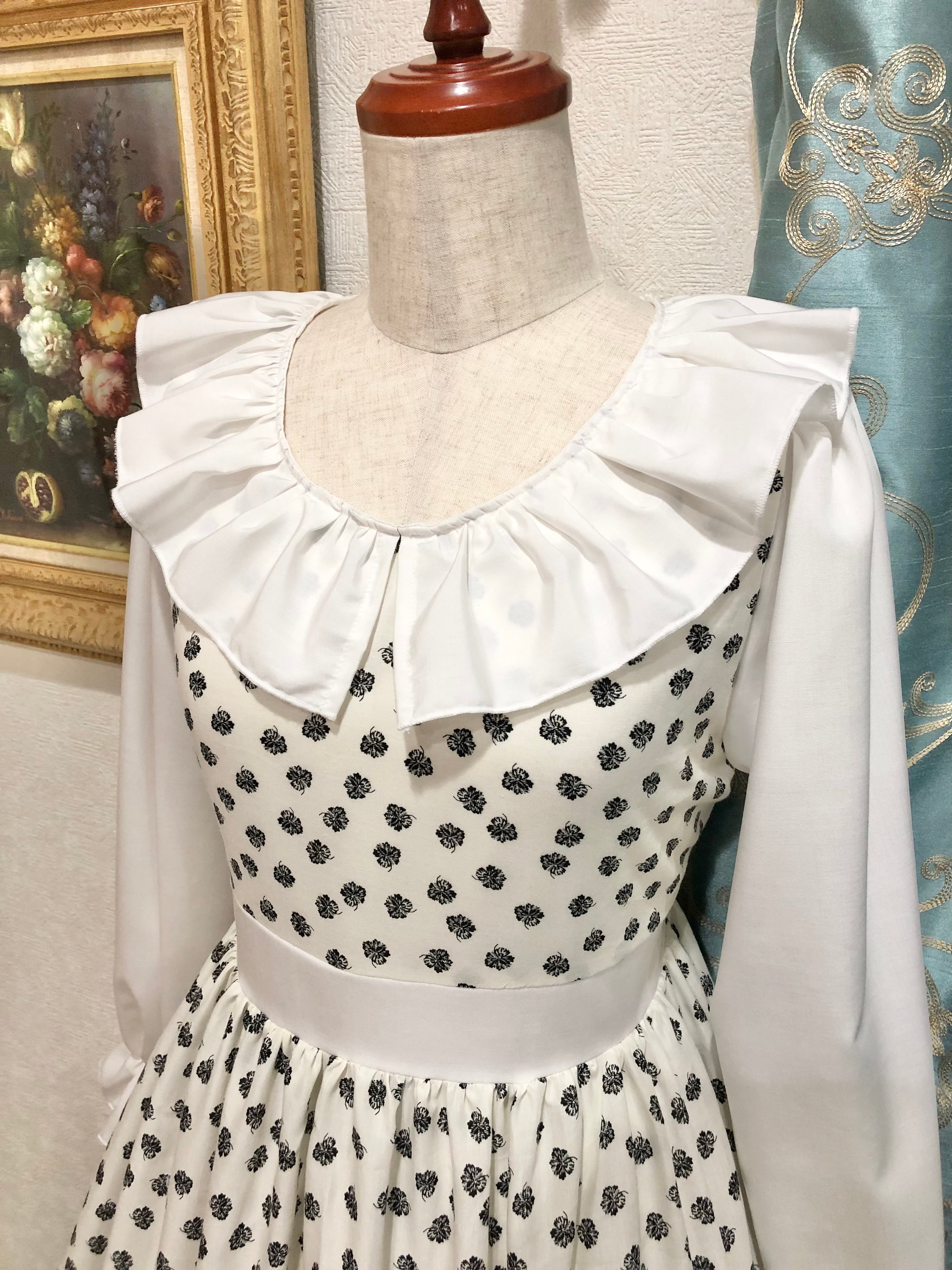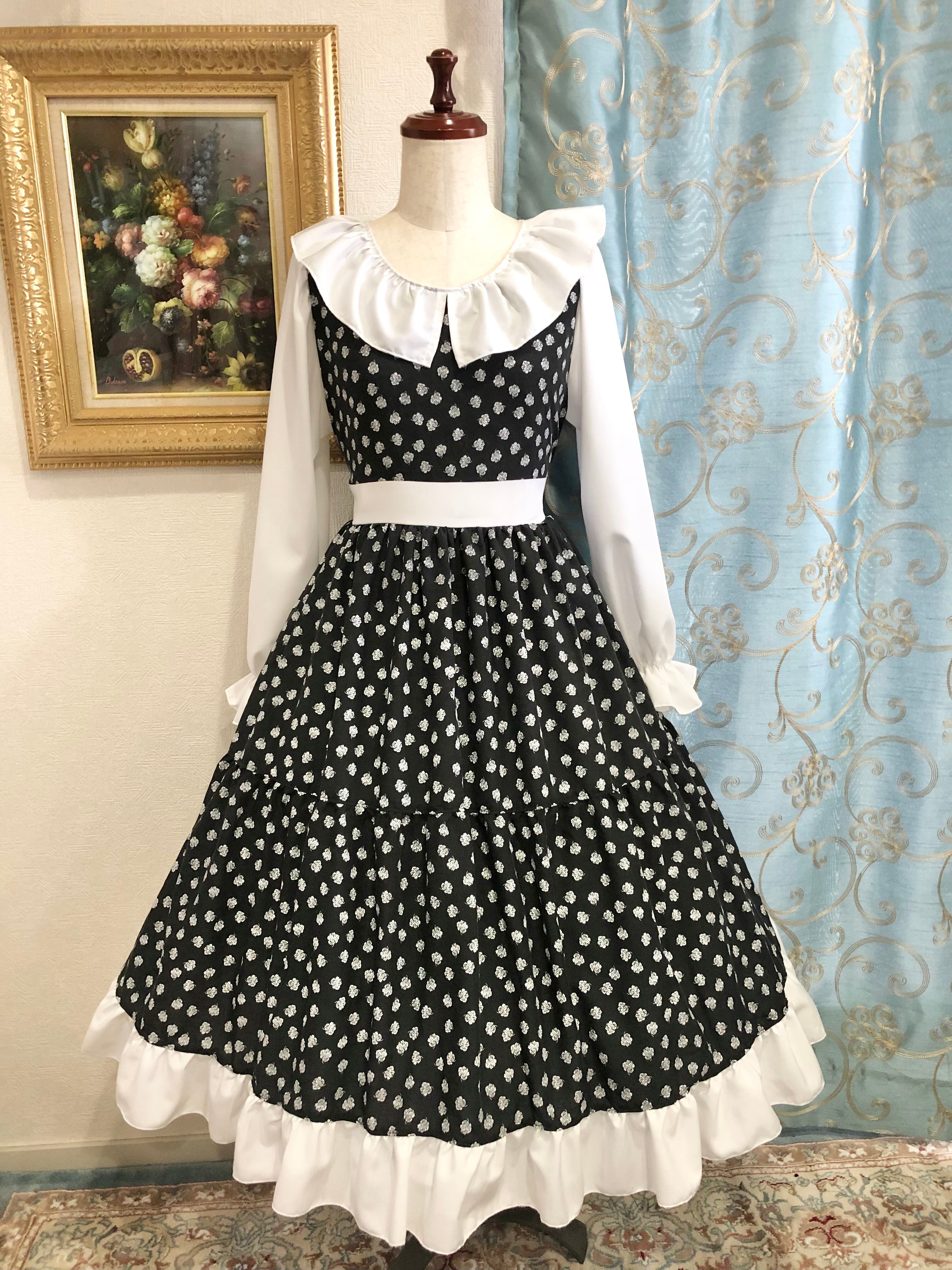 フラワースタンプワンピースは、お花のスタンプ柄のモノトーン生地と3段のティアードが可愛いワンピースです。