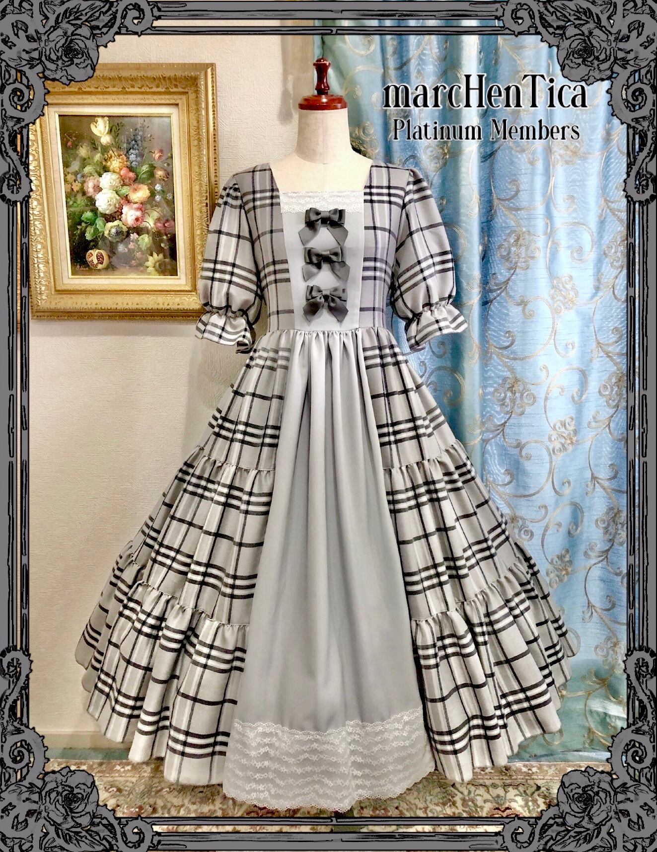モリーワンピースは、正面中央の無地を大柄グレーチェックの生地が挟み込むようなデザインの華やかなワンピースです。
