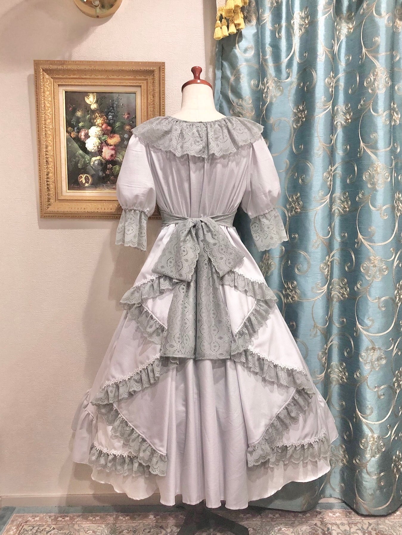 マリアンヌワンピースはレースをふんだんに使った優美なワンピースです。特に後ろスカートのヒダが豪華で、正面のデザインは飾り過ぎなく上品に仕上げています。