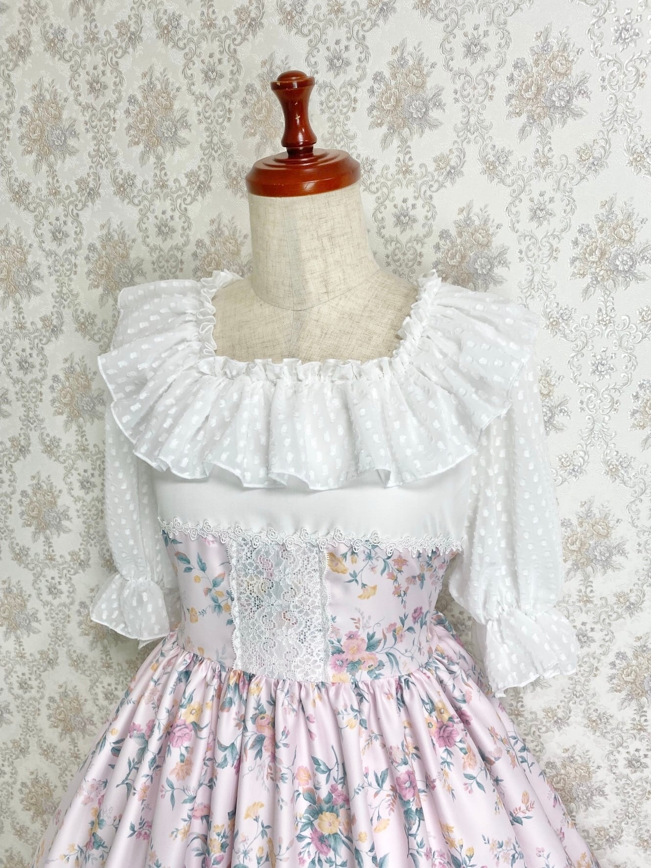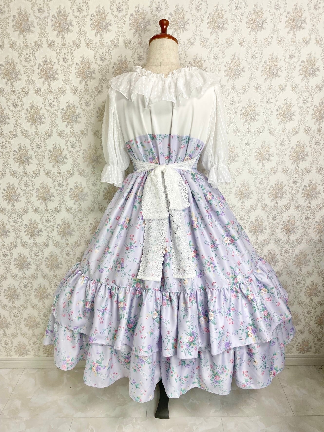フルーリールワンピースはブラウスとハイウエストスカートを組み合わせたような切り替えが可愛らしいワンピースです。袖と襟元にはドット柄に織られた涼し気な素材を使用し、スカートの裾は重なる2段フリルで華やかな印象です。