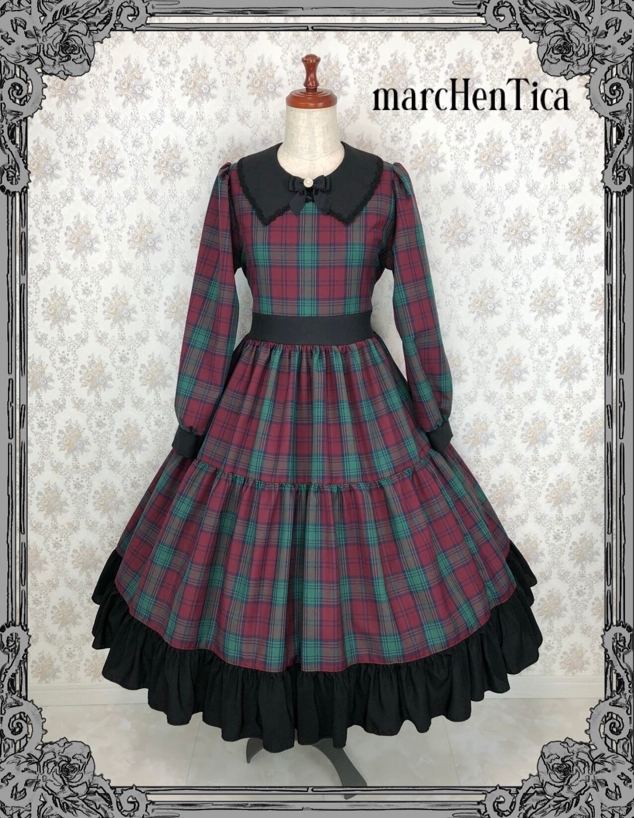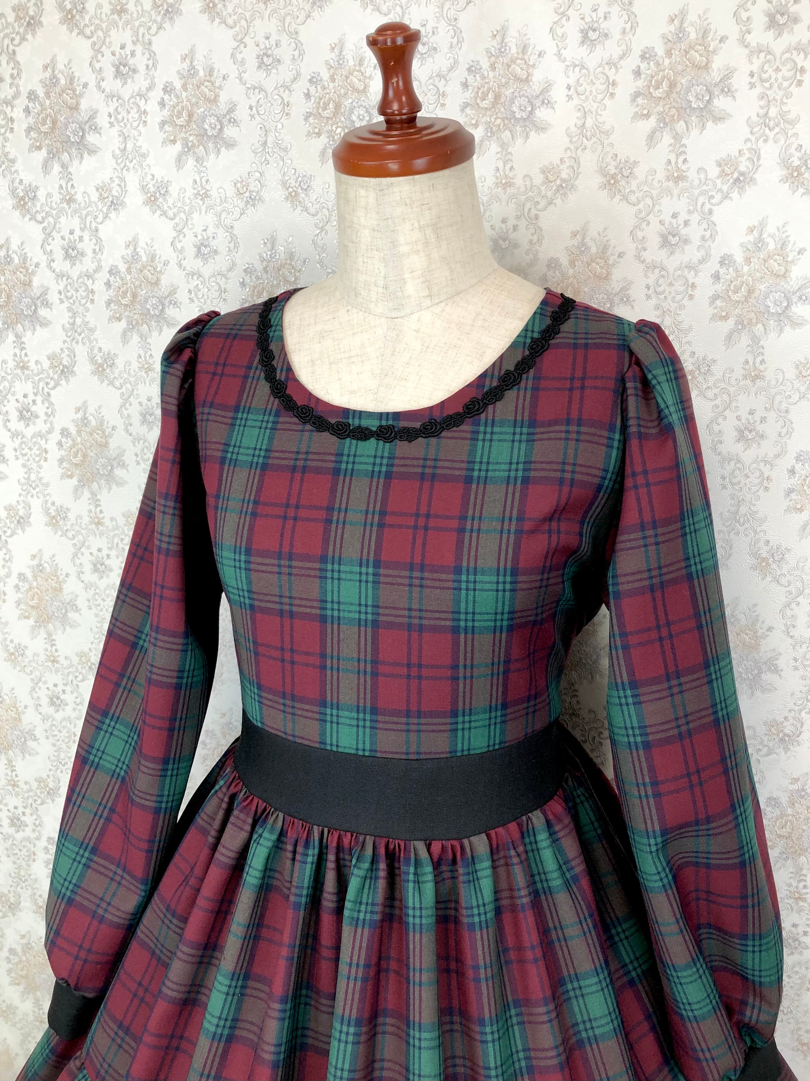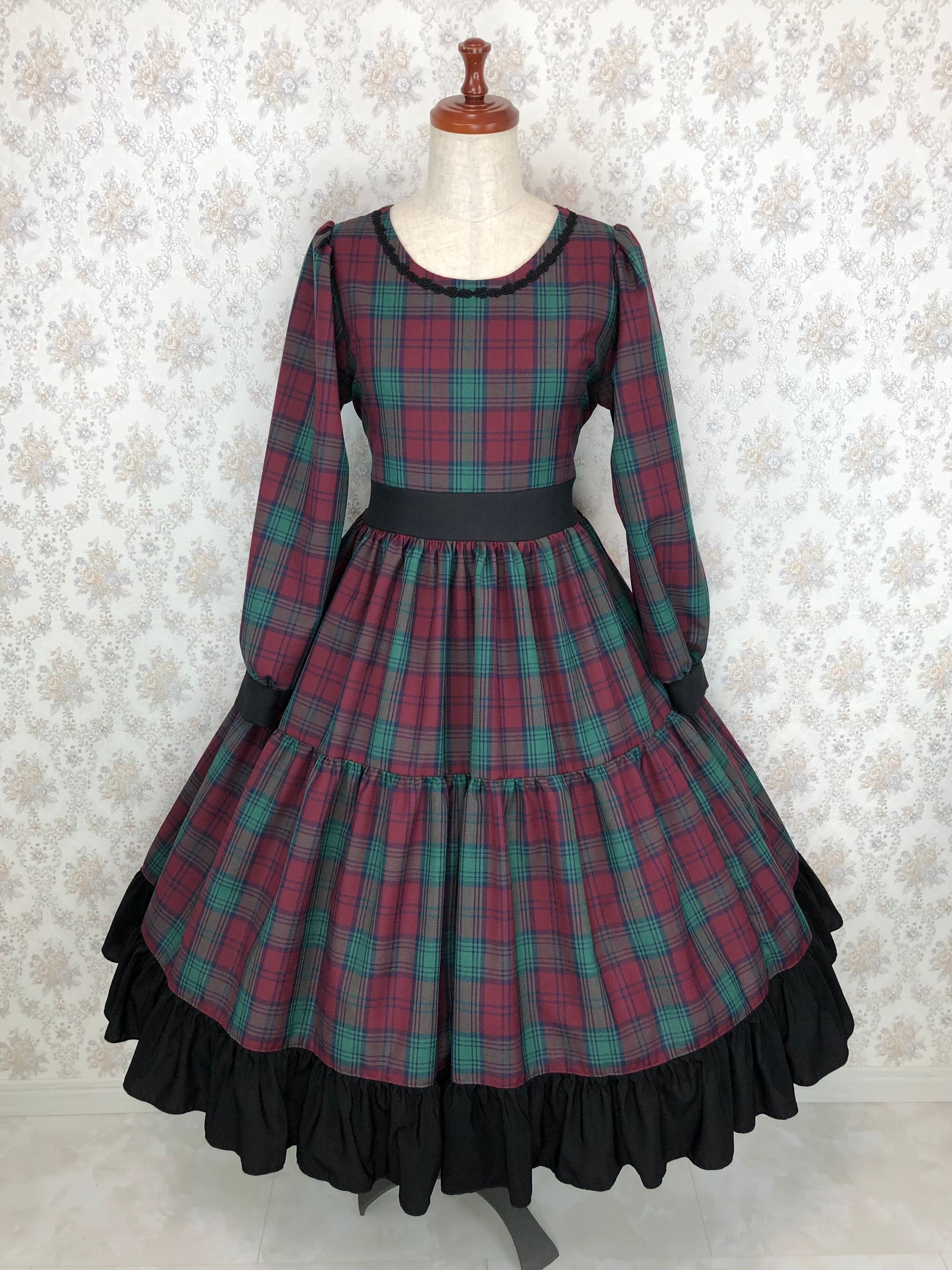 ライラワンピースは赤と緑の暗めチェックに黒無地を合わせたティアードワンピースです。