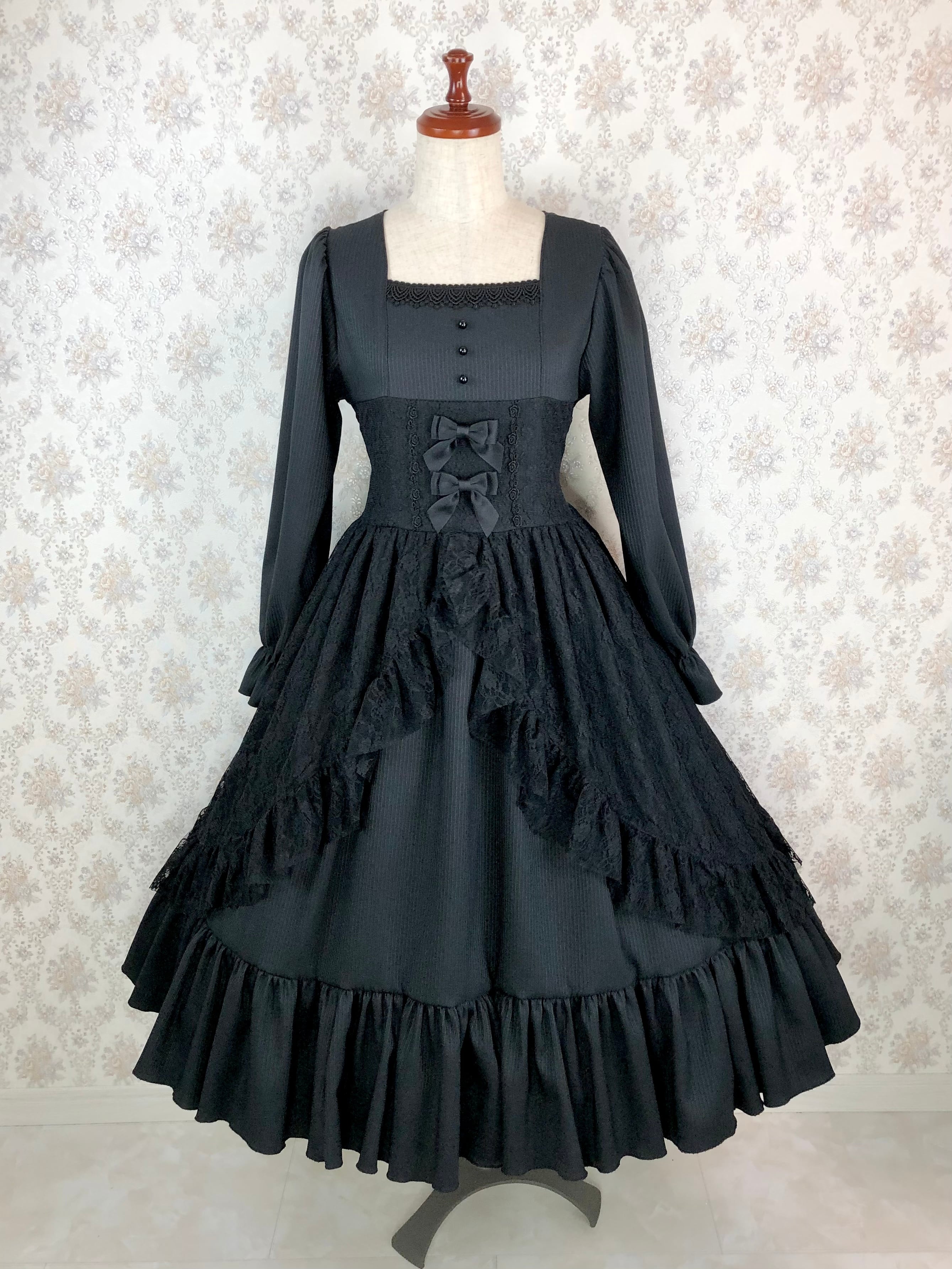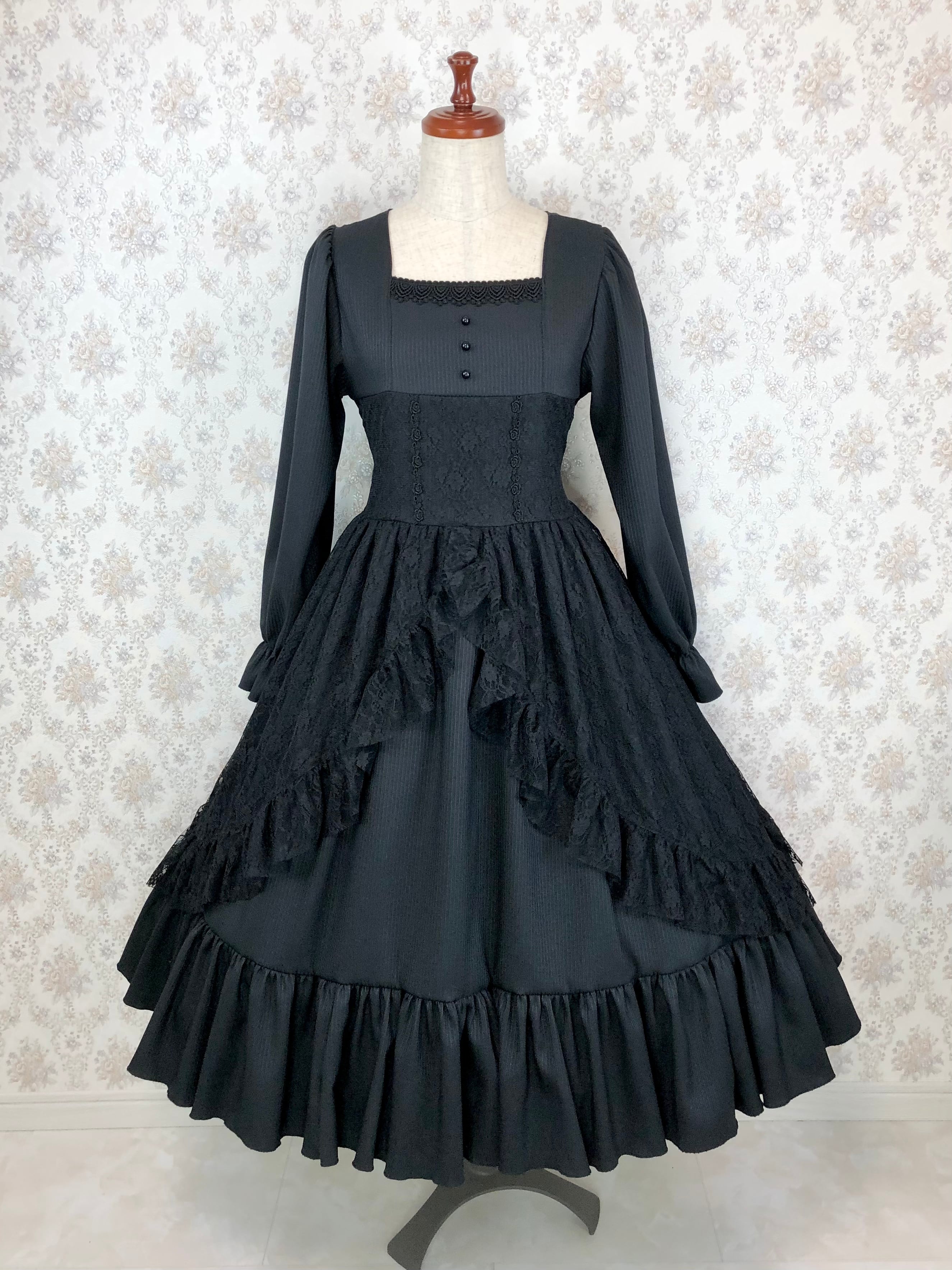 ノワールワンピースは高品質な黒のストライプ生地にコルセットオーバースカート風に黒レース生地を重ねた、豪華なワンピースです。