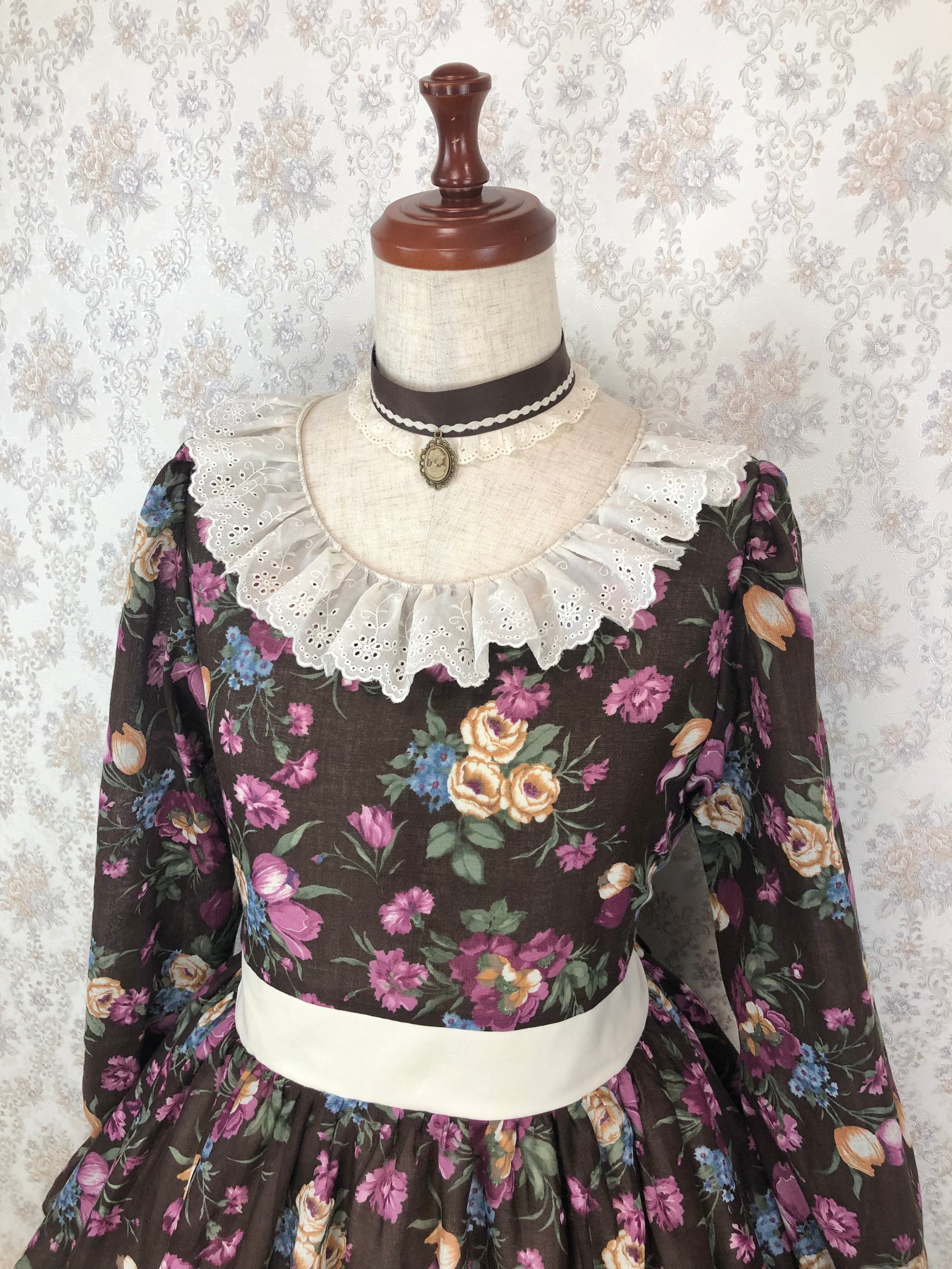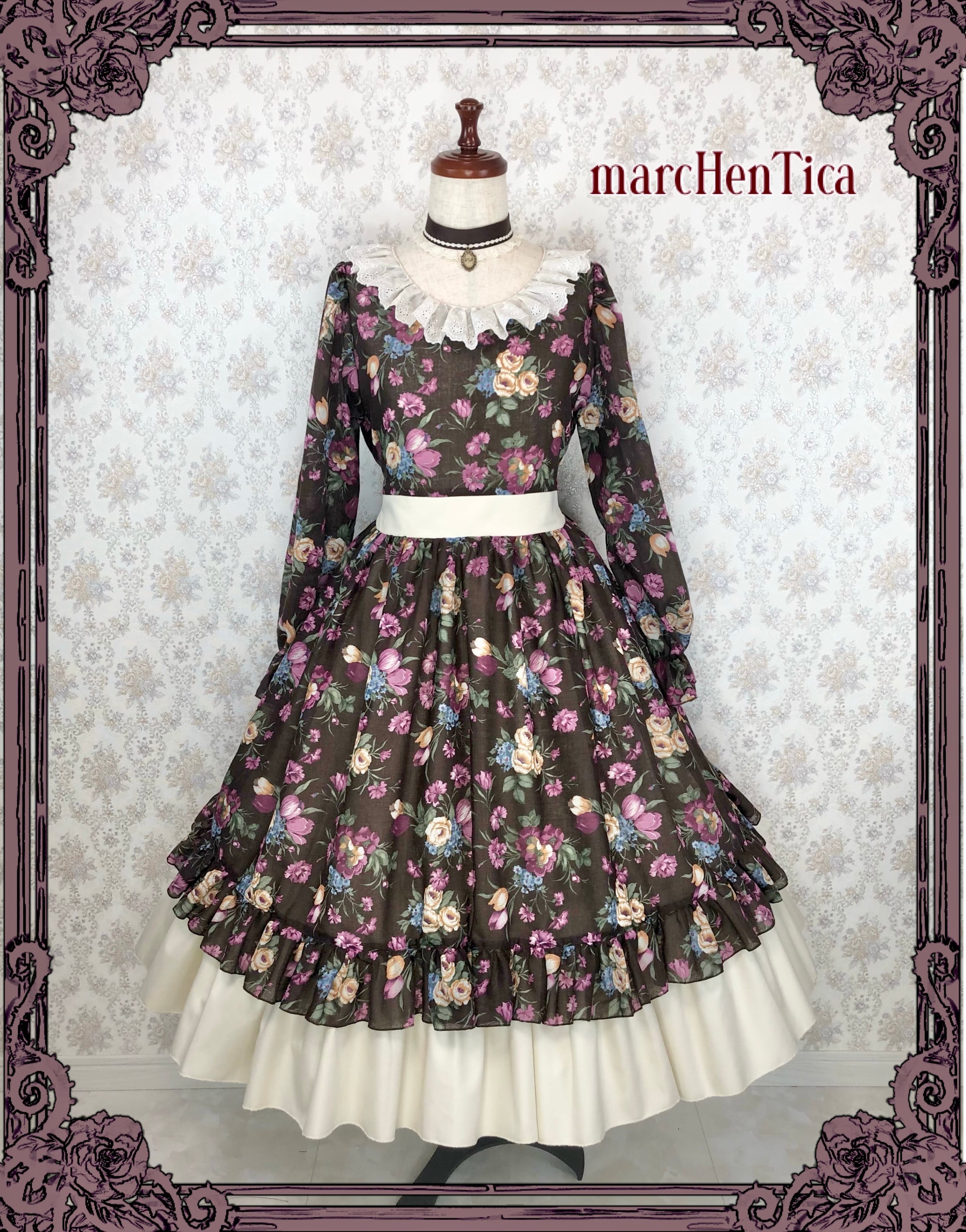 フロイラインワンピースはライトベージュの無地にブーケ柄のガーゼ生地を被せた、上品で華やかなワンピースです。