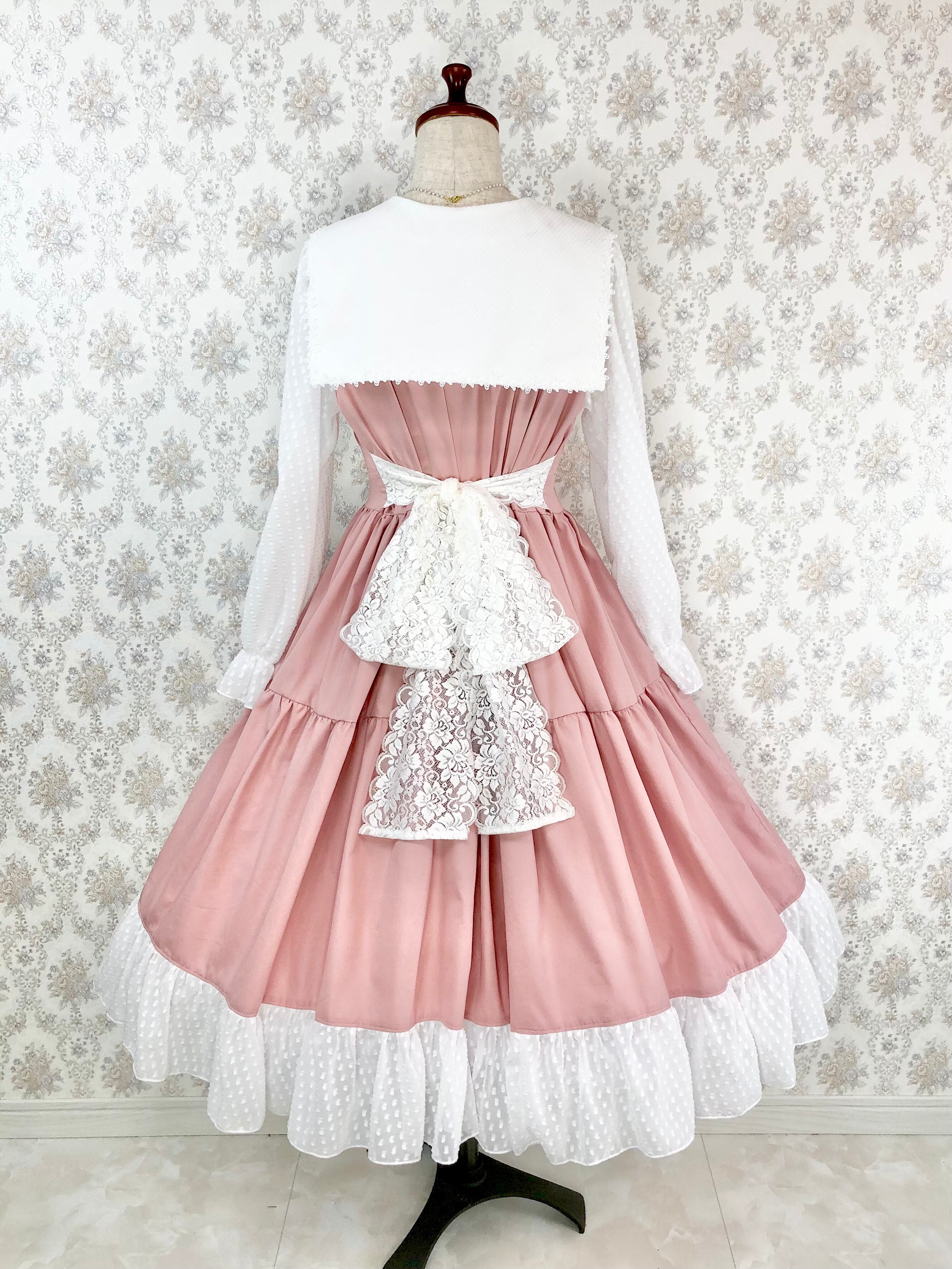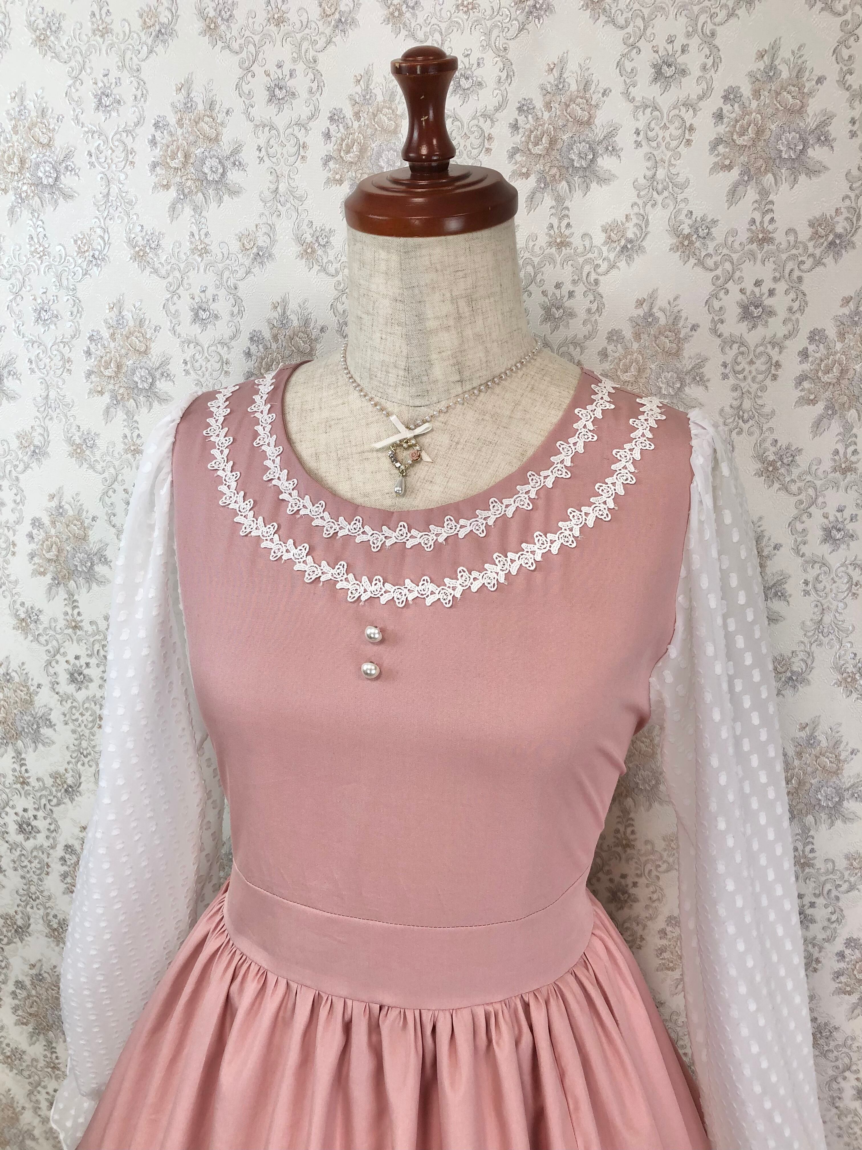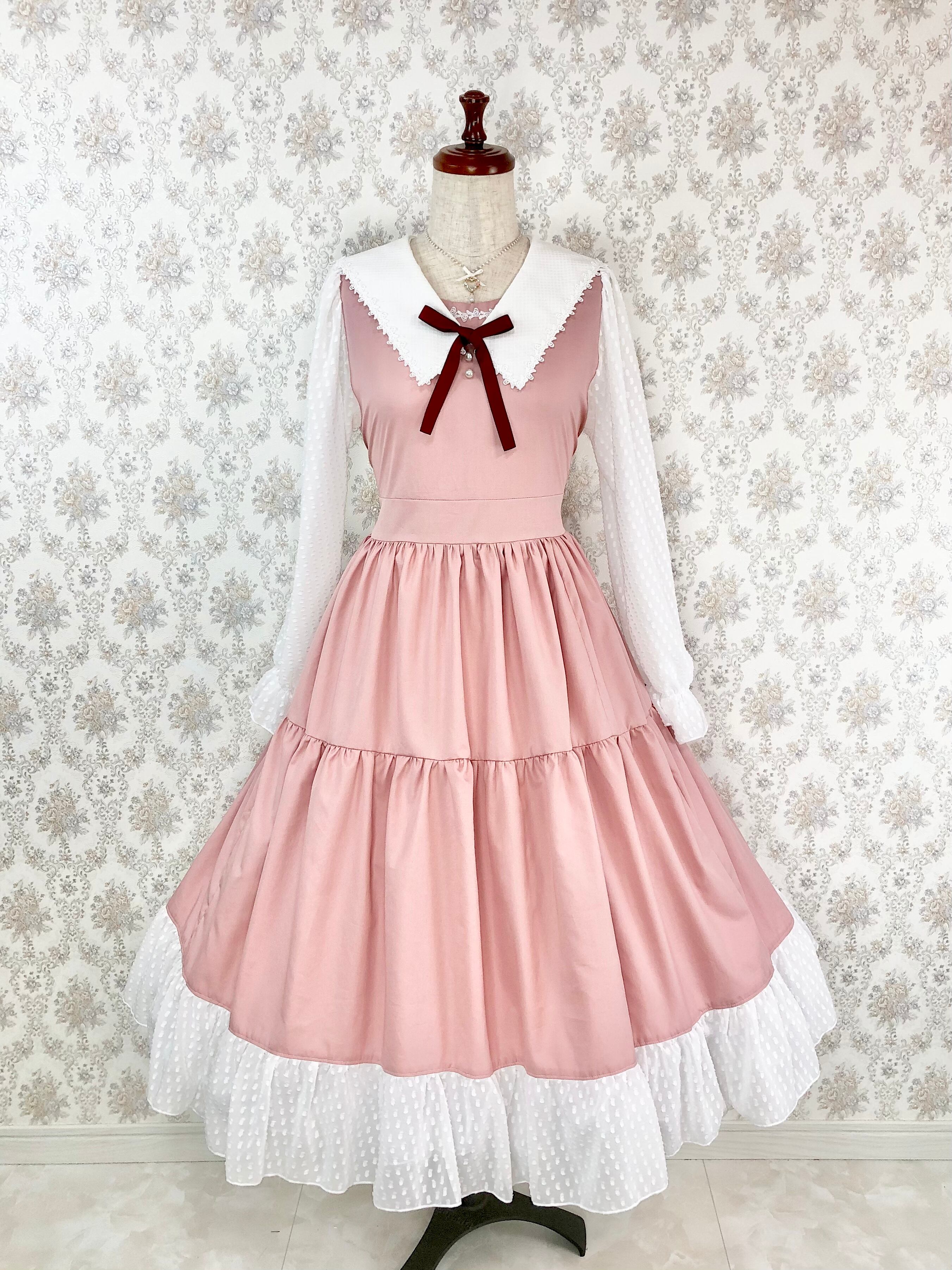 エイミーワンピースはくすみピンクの光沢感のある生地と凹凸感が可愛い白のドット生地が、まるでブラウスとジャンパースカートを合わせたかのようなデザインの可愛らしいティアードワンピースです。