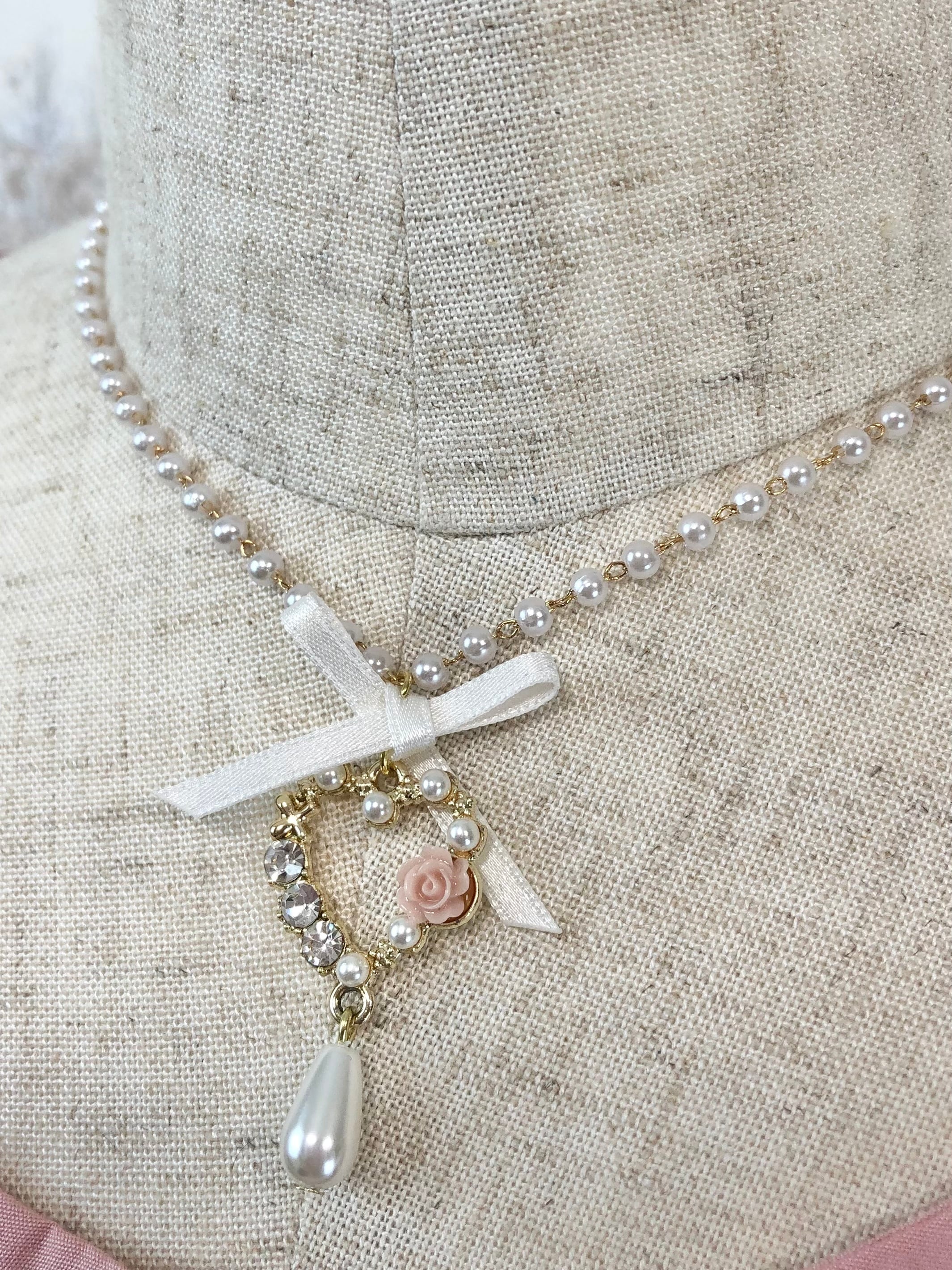 2連のパールネックレスをイメージした胸元の薔薇レースが上品です。