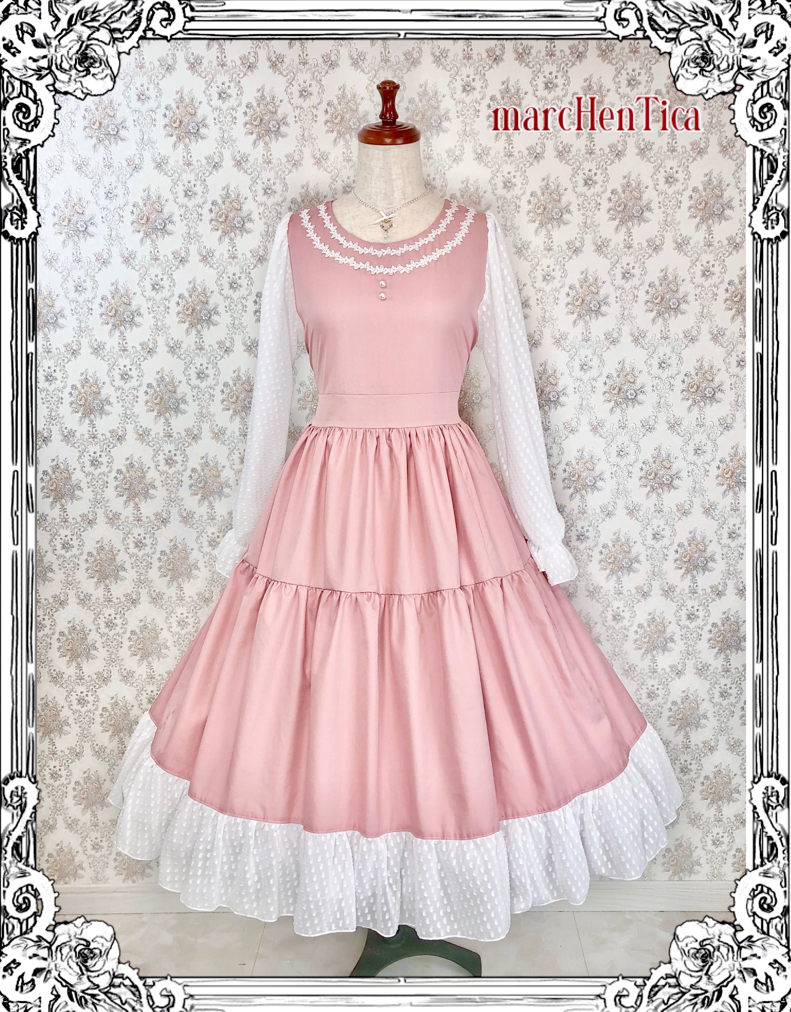 エイミーワンピースはくすみピンクの光沢感のある生地と凹凸感が可愛い白のドット生地が、まるでブラウスとジャンパースカートを合わせたかのようなデザインの可愛らしいティアードワンピースです。