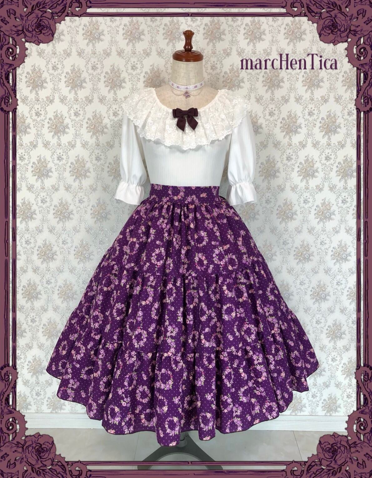 フラワークラウンワンピースは、花冠柄の生地がかわいスカートにブラウスを合わせたようなデザインの切替ティアードワンピースです。