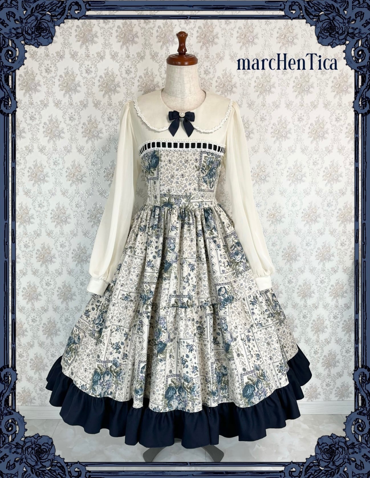 胸元の切替部分にあしらったはしごレースに通されたリボンと、裾のフリルが引き締めカラーになっています。